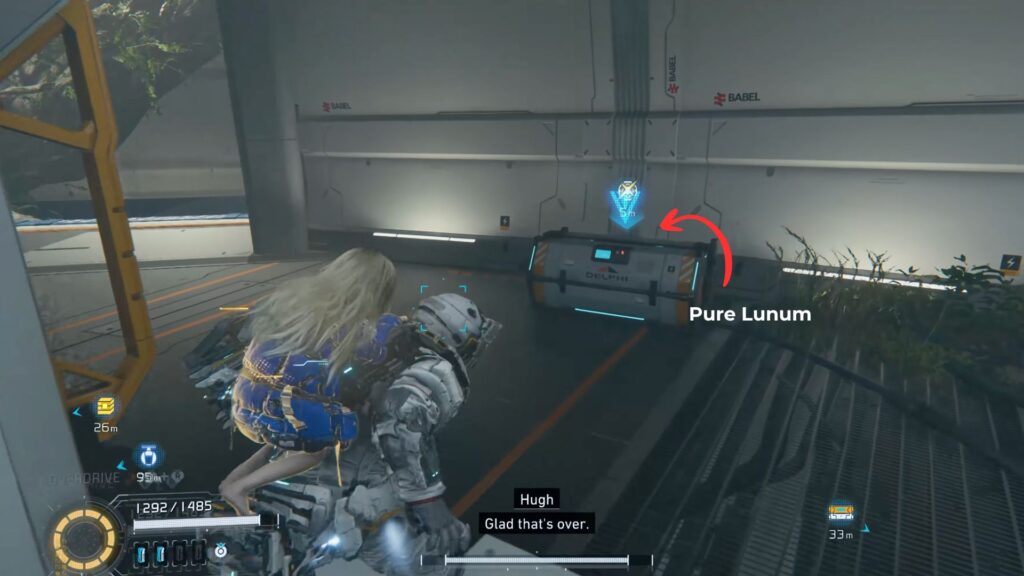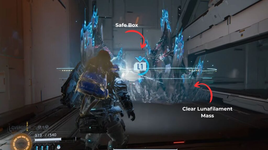 Scan the area for a blast door left partially open. Climb the crate in front of it, pull yourself onto the top of the door, and drop behind it. Diana can clear Lunafilament Mass on the back wall to reveal a Safe Box with Lunafilament. Hack the nearby panel to lower the blast door and open the way forward.