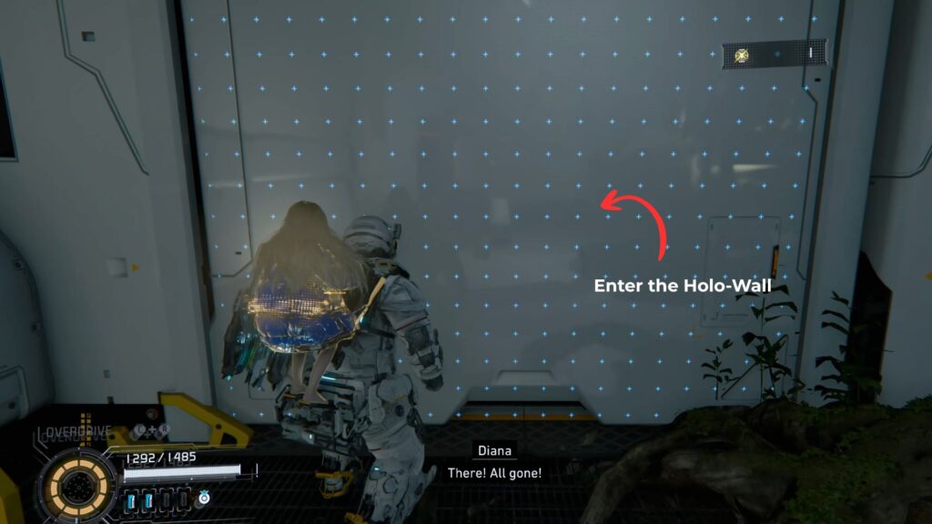 Then go back to where you came from after crossing the branc and look right along the pathway to find the first Holo-Wall at the end.