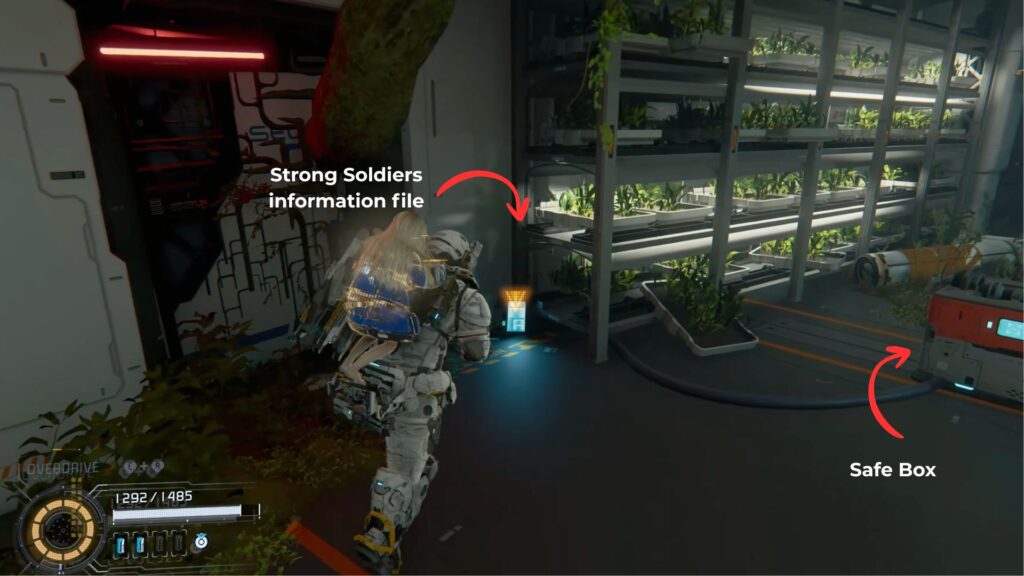 Go through the unlocked door and take a right past the tangle of vines to find a Holo-Wall. Inside, look in the corner for a tablet with the Strong Soldiers information file. The Safe Box inside rewards 500 Lunafilament.