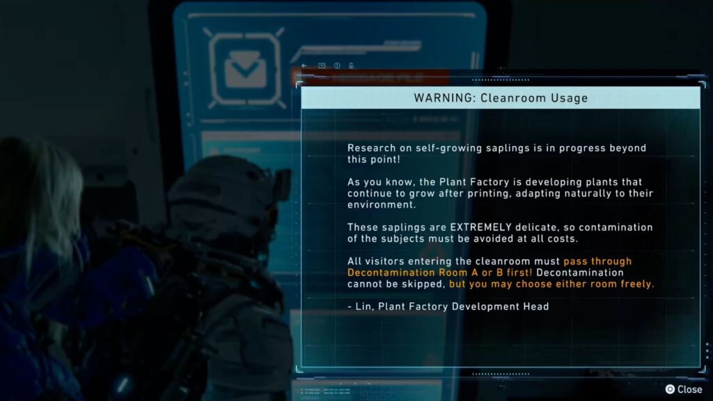 Once they’re down, the path opens. Take the lift up and check the board near it for the WARNING: Cleanroom Usage file.