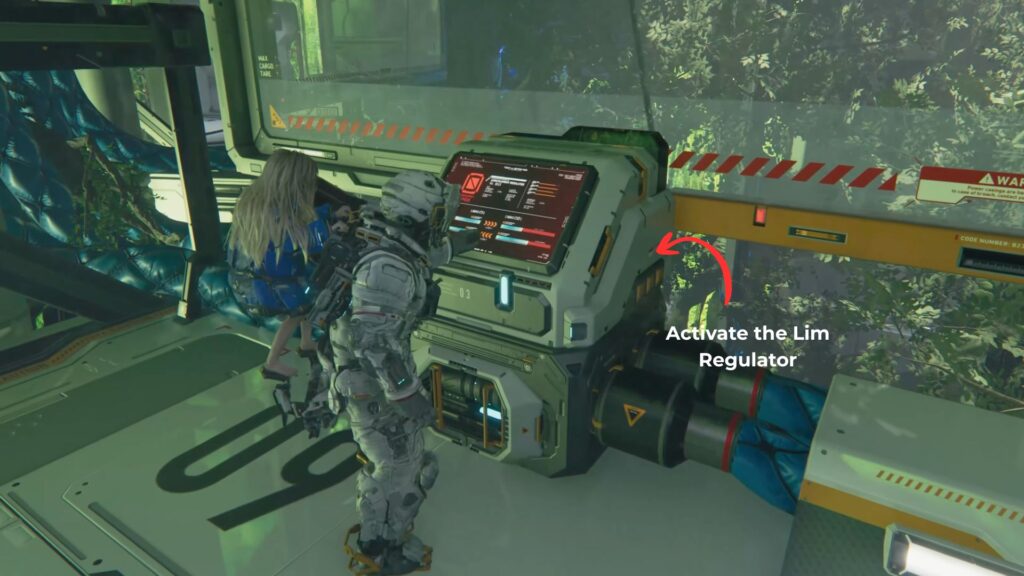 Go through the next door and activate the Lim Regulator to clear more plants, then jump down back to the center area after that. If you still need to finish the Eco Modeling Lab, go there next. Otherwise, continue to Block 3.