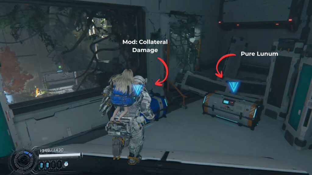 After clearing the Red Zone, head into the room next to the one with the large glass wall. Inside you’ll find Mod: Collateral Damage, which causes Critical Shot damage to spread to nearby enemies at 30%, along with a Pure Lunum.