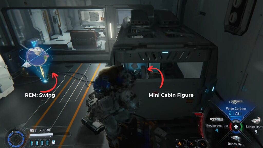 Check the container beside it for a Mini Cabin Figure, using nearby crates for a better vantage point if needed. Hack the door to return to the map room.