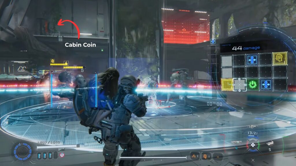 After both waves are finished the exit door opens. Before leaving, cross to the large window on the far side of the room and hack the panel beside it. A ledge will rise up, jump onto it to reach a Safe Box containing three Upgrade Components. From there you can also leap across to a second Safe Box near the entrance holding a Cabin Coin.