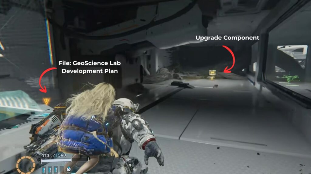 The final room in this section has a lift. Before riding it down, check the door behind it. A small side room holds an Upgrade Component and File: GeoScience Lab Development Plan. When you are ready, take the elevator down to begin the next section.