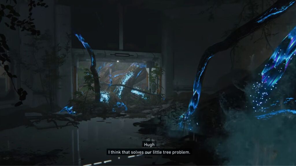 A console sits at the dead end beyond it. Activating it causes the tree to shrink, clearing a previously blocked doorway. Drop to the lower floor and go through the next door.