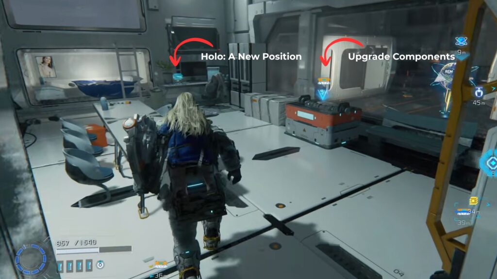 On the other side you will see a holographic map on your right. Go through the door directly across from where you entered to find a Safe Box carrying three Upgrade Components and Holo: A New Position. Return to the map area and hack the door on the right side.
