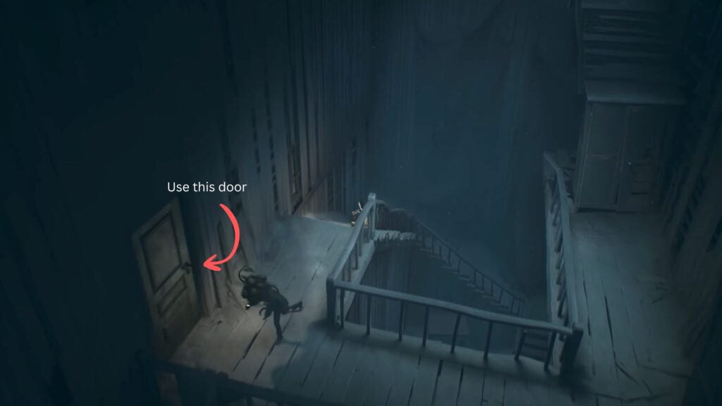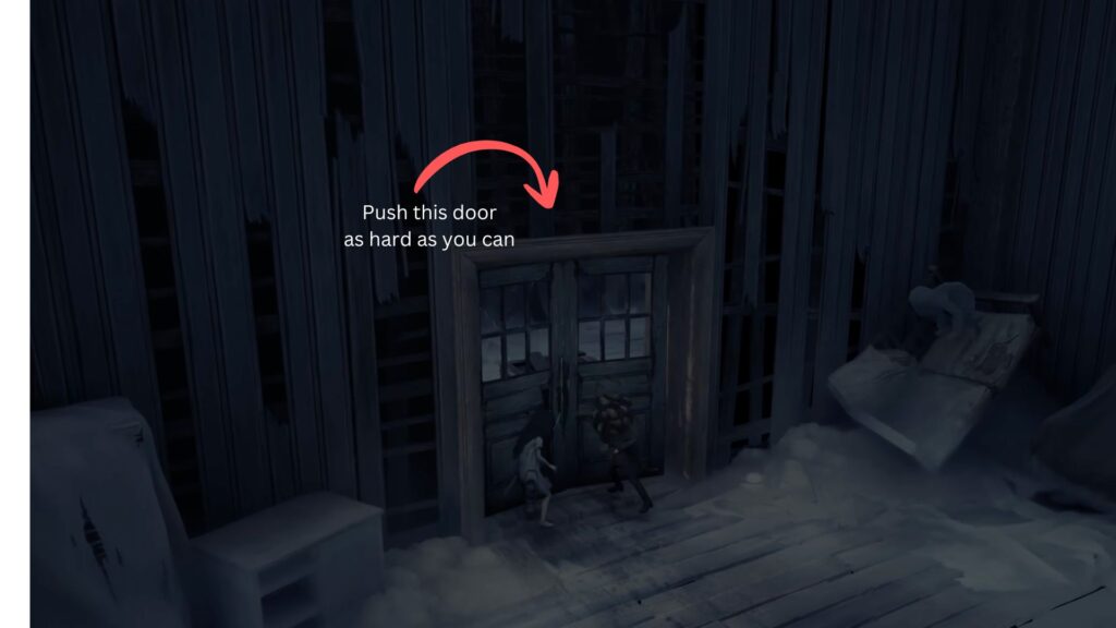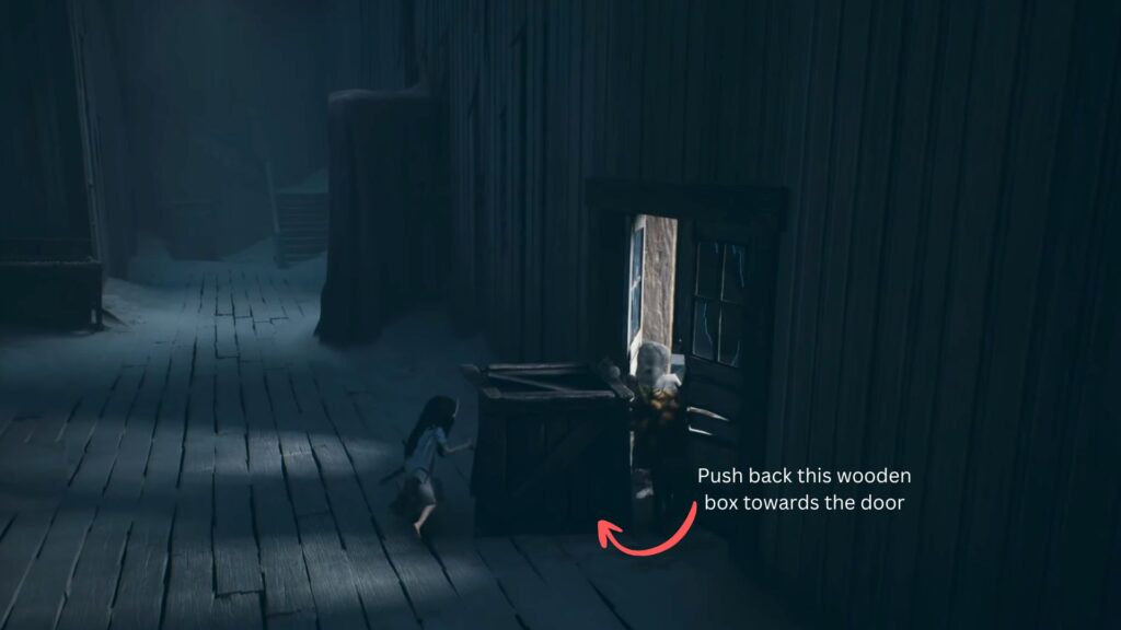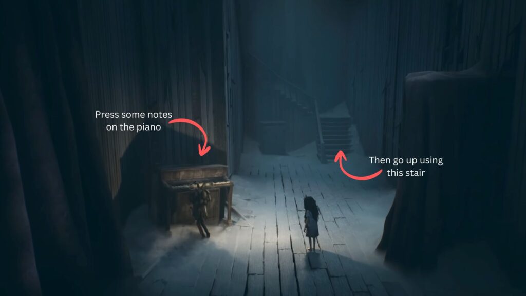 After grabbing it, return to the main room and head straight toward the door ahead. You’ll need to push hard to open it, as a wooden box is wedged against it from the other side. Once it’s open, run inside and immediately push the wooden box back against the door to block anything from following you in. Then press some notes on the piano to accomplish an achievement.