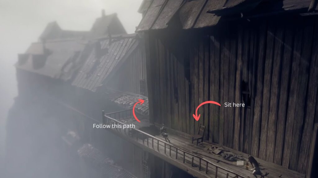 Keep climbing until you reach a second door on the left. Go through it to reach another section of the building. On this balcony you can sit for a while on the wooden chair to get your first Raise Up Your Leg trophy task in this chapter.