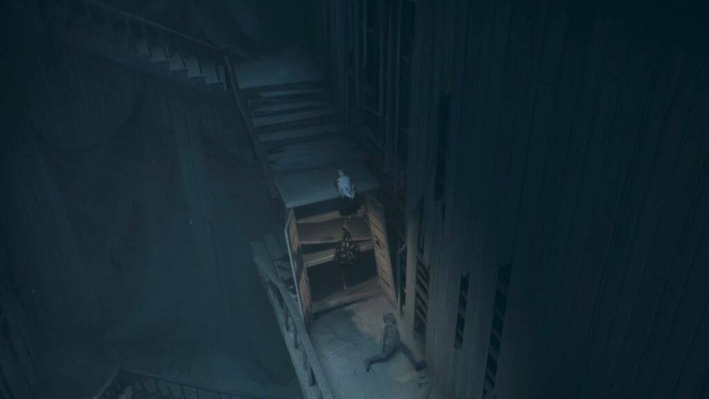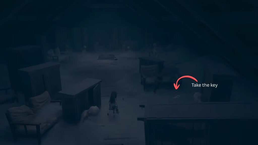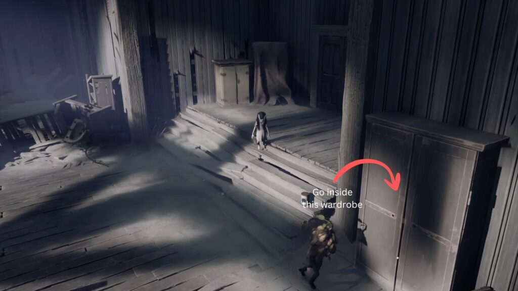 A large wardrobe is now blocking your path — open it, but be ready, as a baby ghost will leap out at you. Your sister will help you take it down. After dealing with it, help her climb on top of the wardrobe to get over it, and she’ll pull you up from the other side.