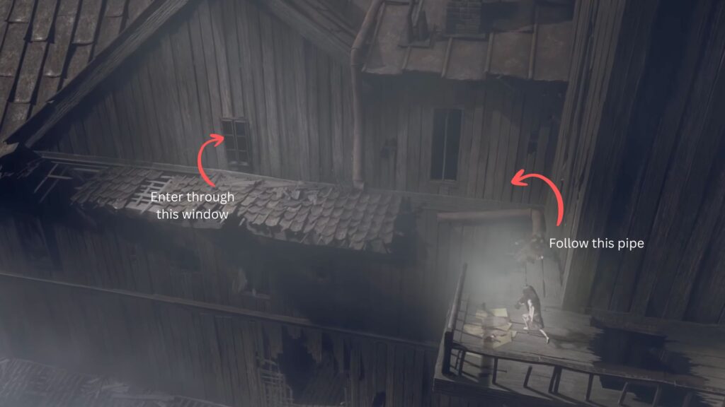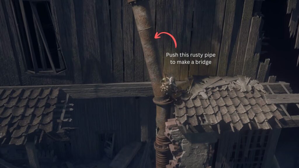 Watch out for the holes in the floor — follow the wooden floor carefully, walk across the pipe without losing your balance, jump onto the roof, and use your pry bar to open the window on the right.