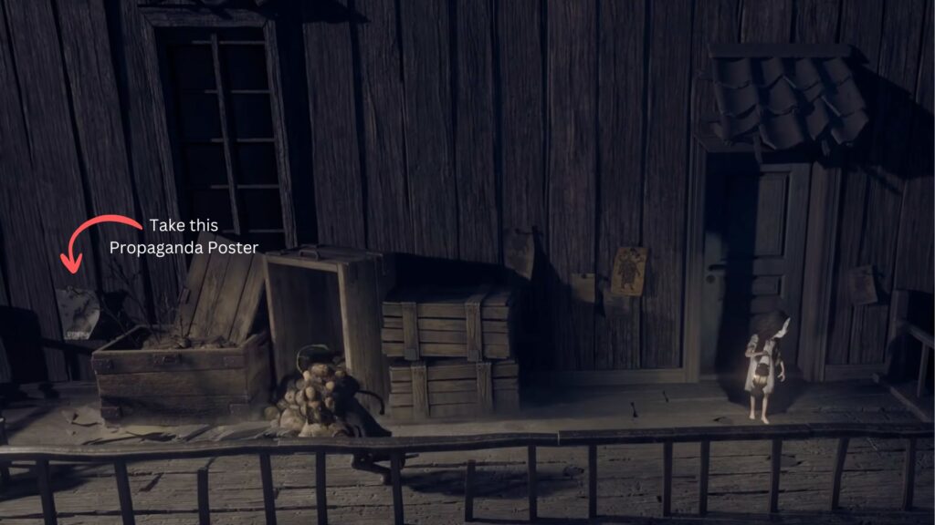 After you come out of the wooden hole, the chain linking you and your sister will finally come undone. On the right side of the room, you’ll notice a large wooden wardrobe. Head over to it and use your pry bar to open it — you will find your first Propaganda Poster on the wall inside worth collecting.