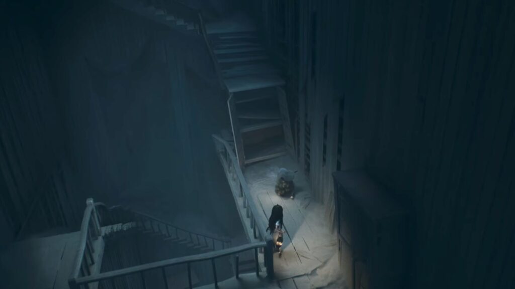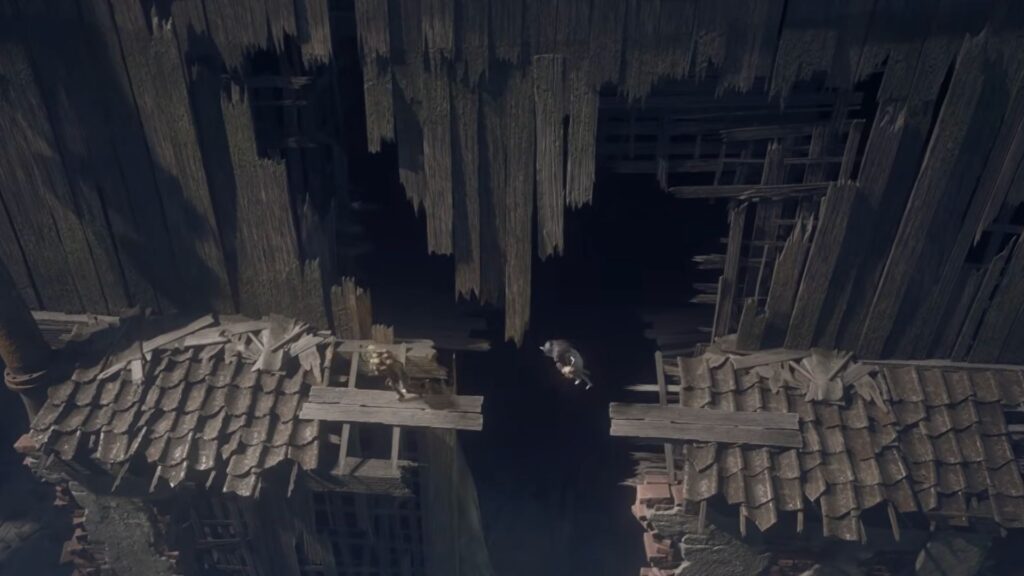 Then, continue until you reach a tall, vertical wooden shaft with broken staircases wrapping around the interior walls. The staircase creates and uneven, spiral-like path going upward, with a large open drop in the center. So a misstep here means falling.
