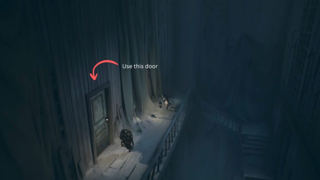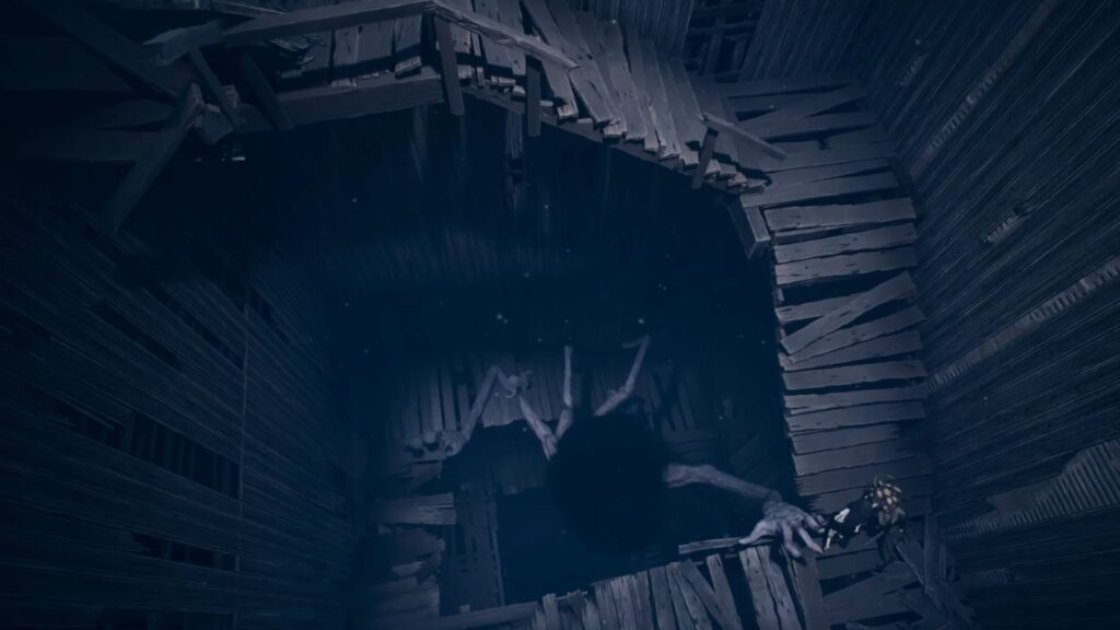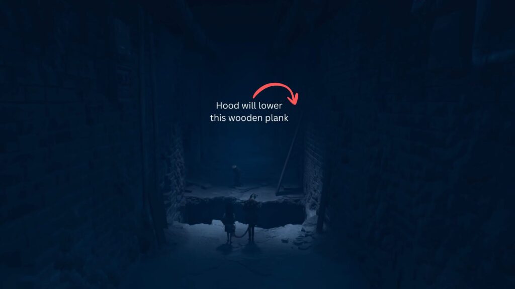 At the end of Chapter 4: No Shelter, you help Hood escape from a wooden box — but he falls back down before you can reach him. A cutscene then plays where the baby ghosts catch you and y our sister, tie you up, and lower you deep underground using a chain hoist. Chapter 5: Down in a Hole begins with you trying to find a way out.