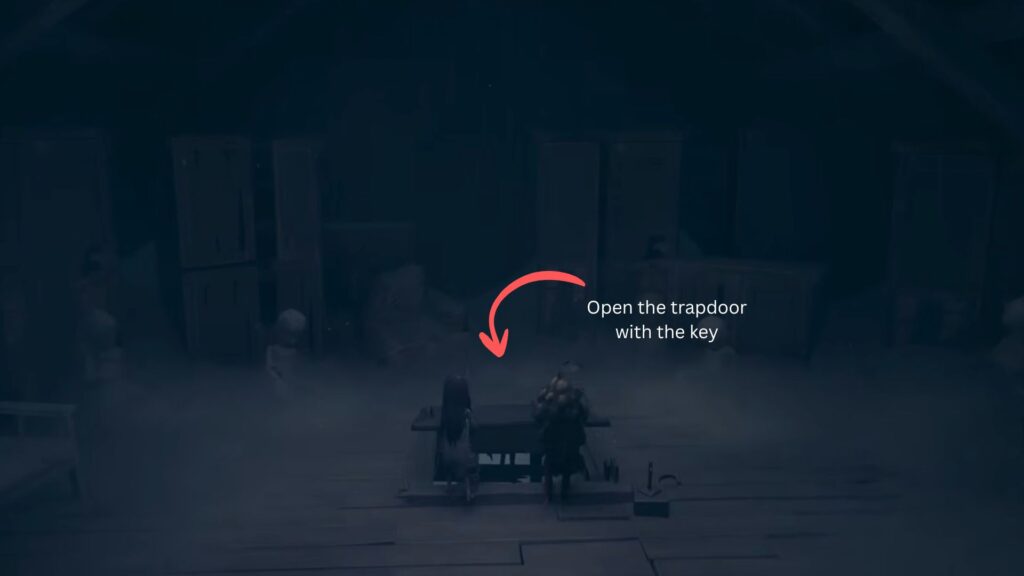 Inside, look to the right near the sofa to find a key on the floor. Pick it up, then use it to unlock a trapdoor in the floor. You and your sister will open it together and drop down inside, landing in a pile of skulls.