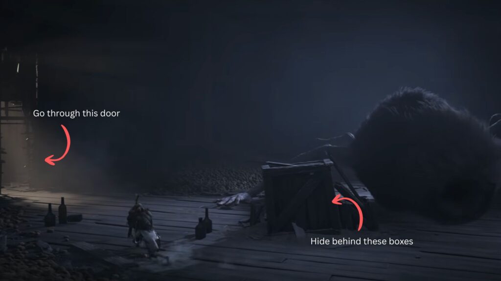 The massive spider monster from earlier will also drop through the hole shortly after. Use the boxes in the area as cover, stay crouched, and work your way into the next area without being caught.