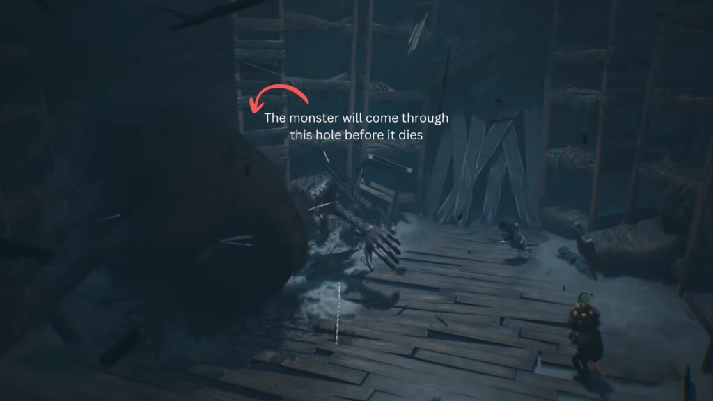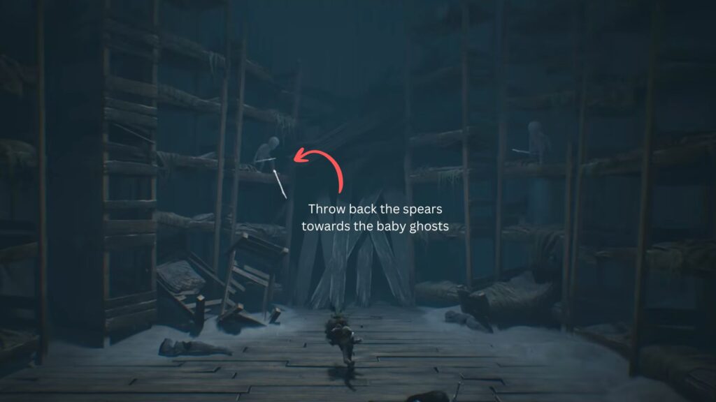 The massive spider monster will charge in and out of the wooden planks repeatedly. While it’s away, focus on dealing with the baby ghosts, who are actively trying to attack you during the fight. Whenever a baby ghost throws a spear at you, dodge it, pick it up off the ground, and throw it back at them. Spears are your main weapon throughout this encounter.