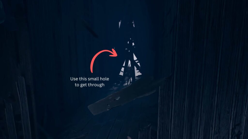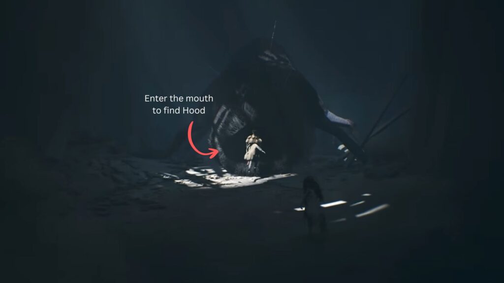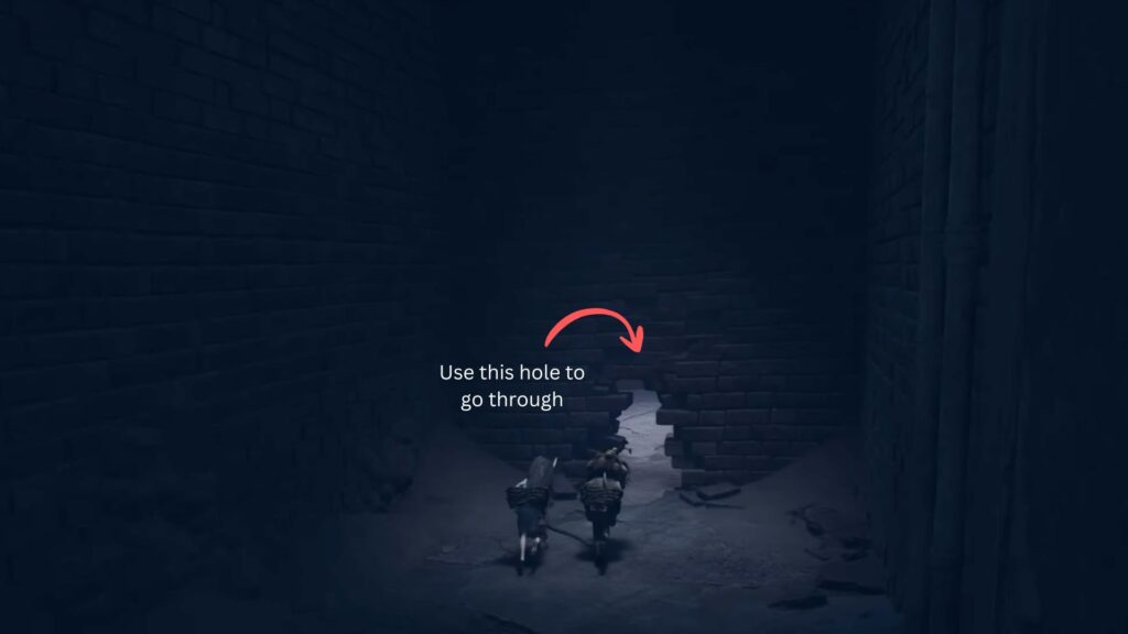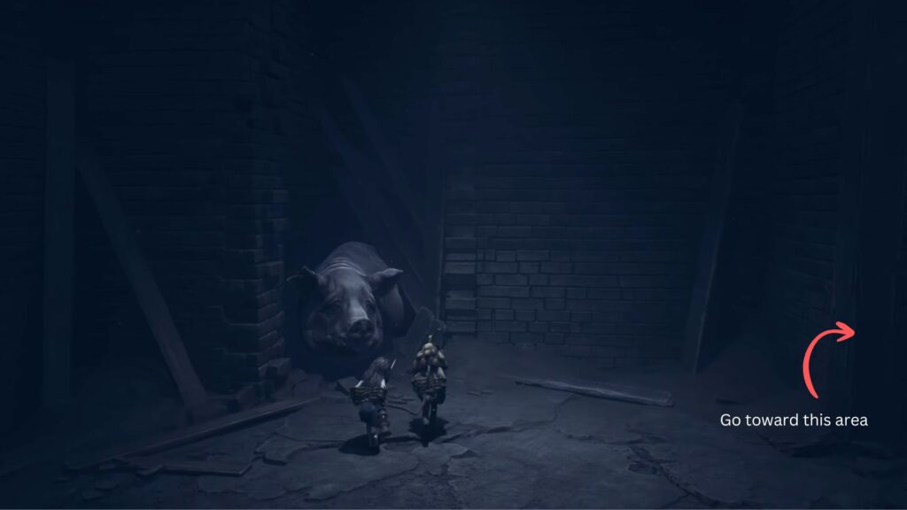 Eventually, you’ll come across Hood waiting beside a hole. He’ll help lower a wooden plank so the group can reunite. Keep following the path until a giant pig runs past you. It won’t attack you, though. Just follow it until it gets stuck in a small opening. Once it does, look to the right to find a small hole in the wall. Crawl through it to move on to the next area.