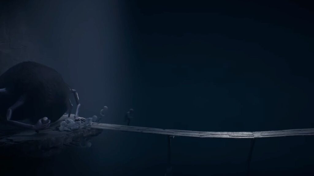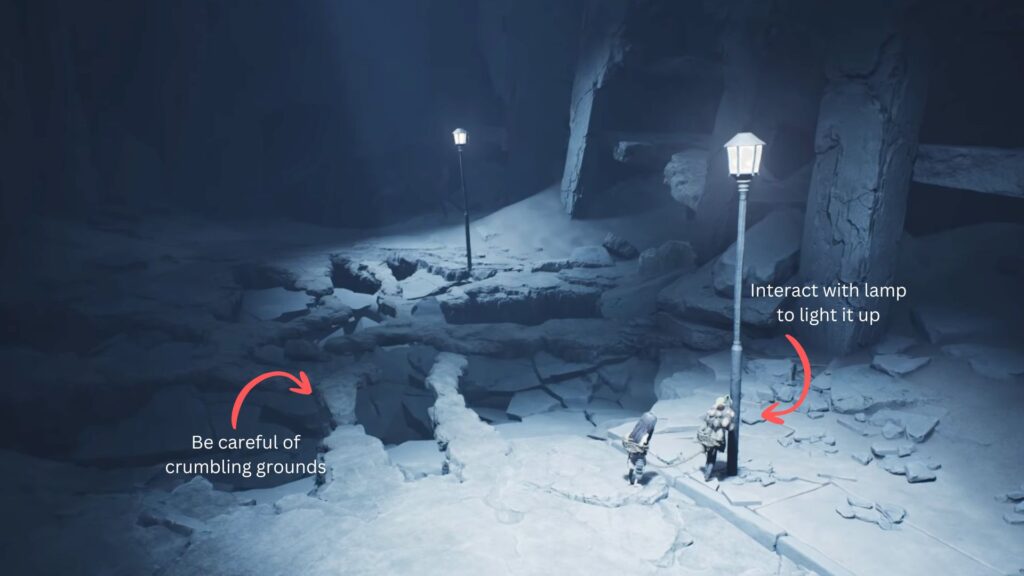 Keep jerking your body until you both break the chain hoist. Once you’re free from it, you’ll quickly discover that you and your sister are chained together. But that’s fine, just keep going forward through the tunnel, jump over holes as you go. Whenever creatures rise up from below, stop and hide until they pass. You can interact with the lamps along the path to light them up, giving you a clearer view of what’s ahead before moving forward.