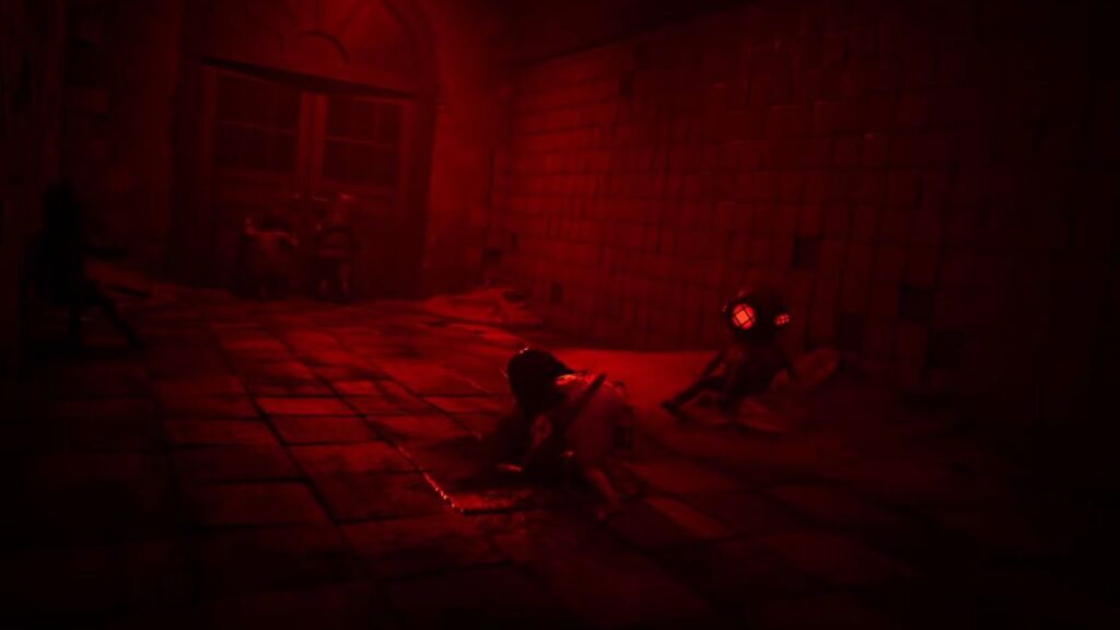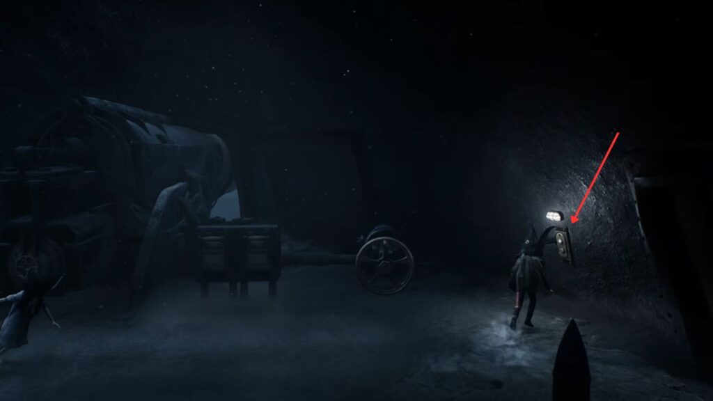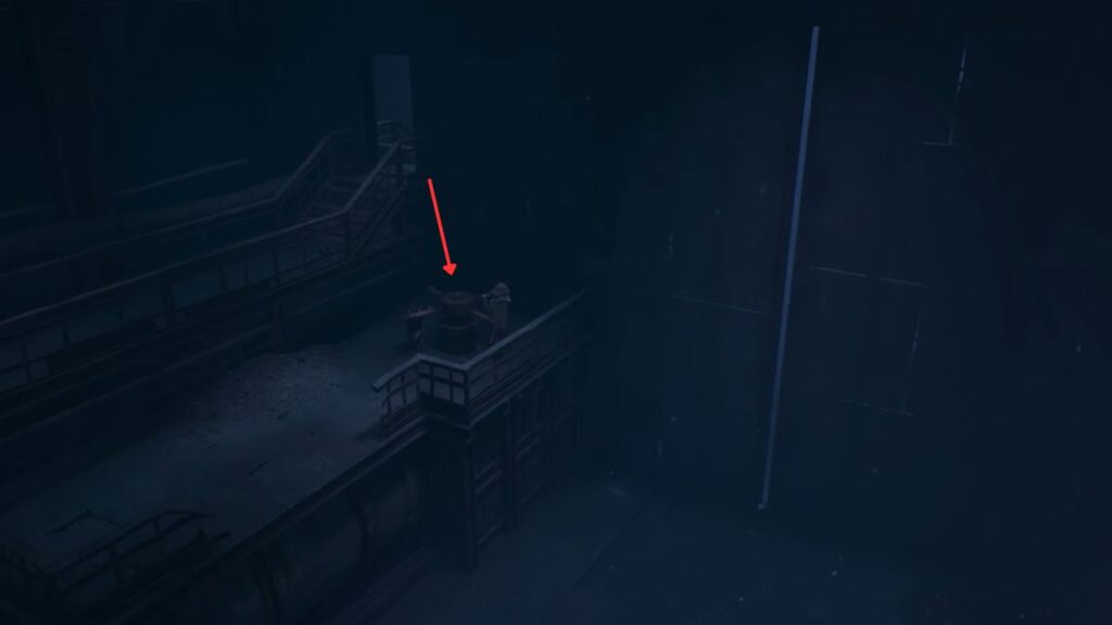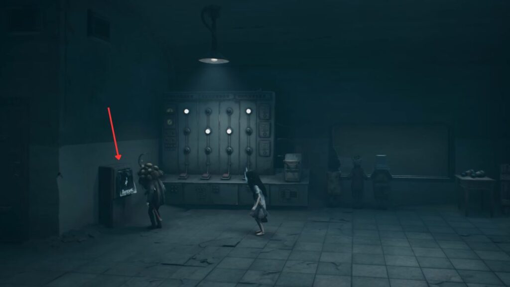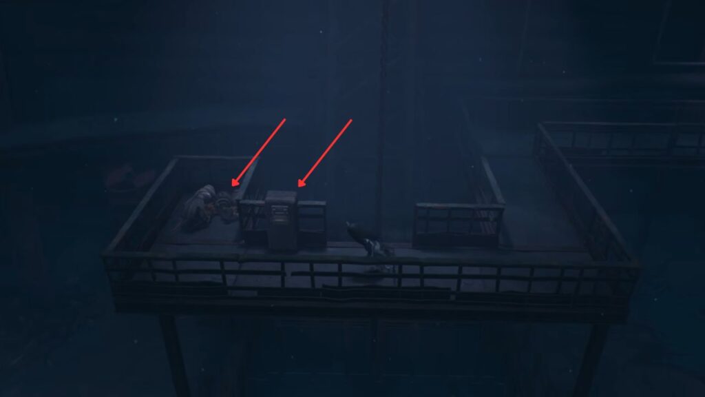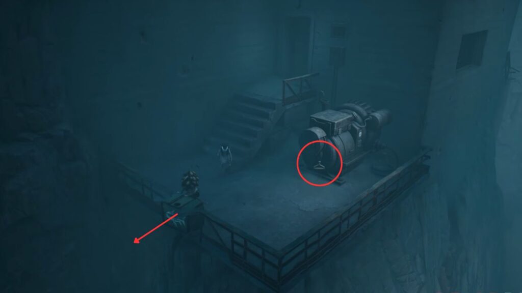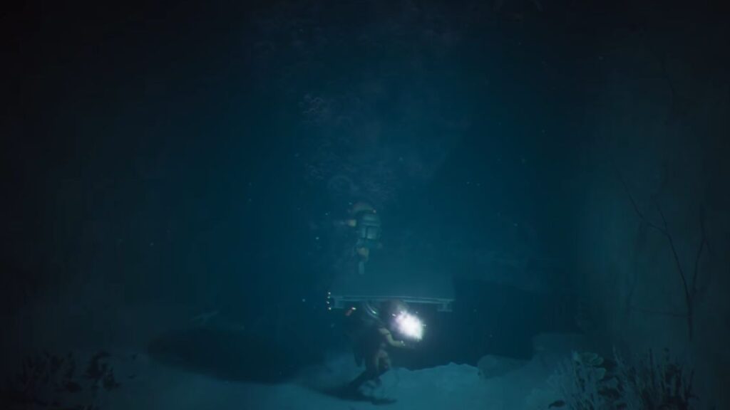 Move past the newly opened gate and climb the wall on the left. Follow the platform to the end and pull the lever to call the elevator. Before heading down, interact with the diving suits on the left side to put them on. We’re going underwater!