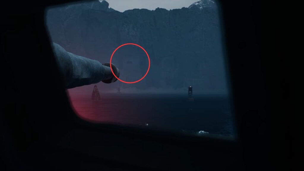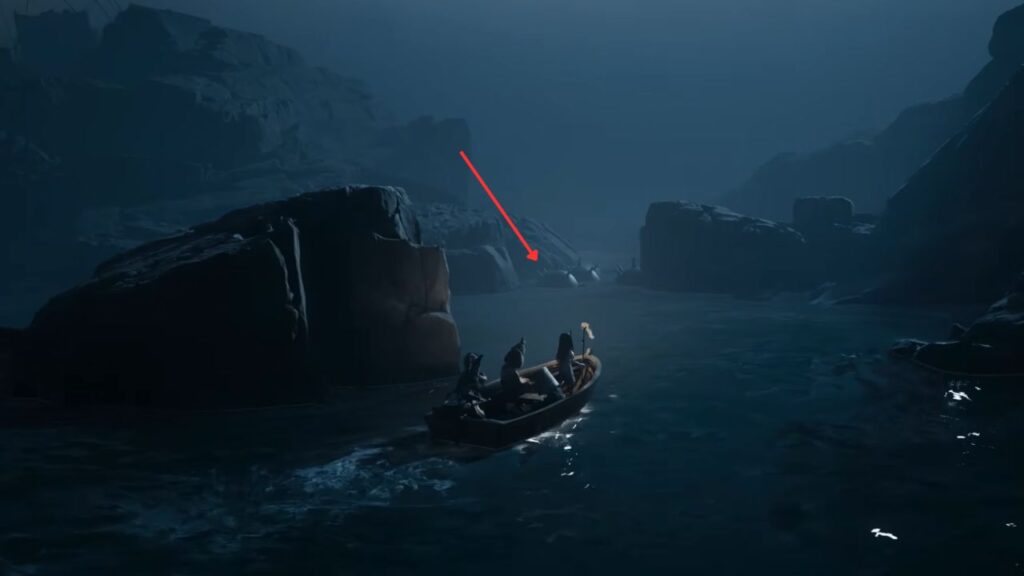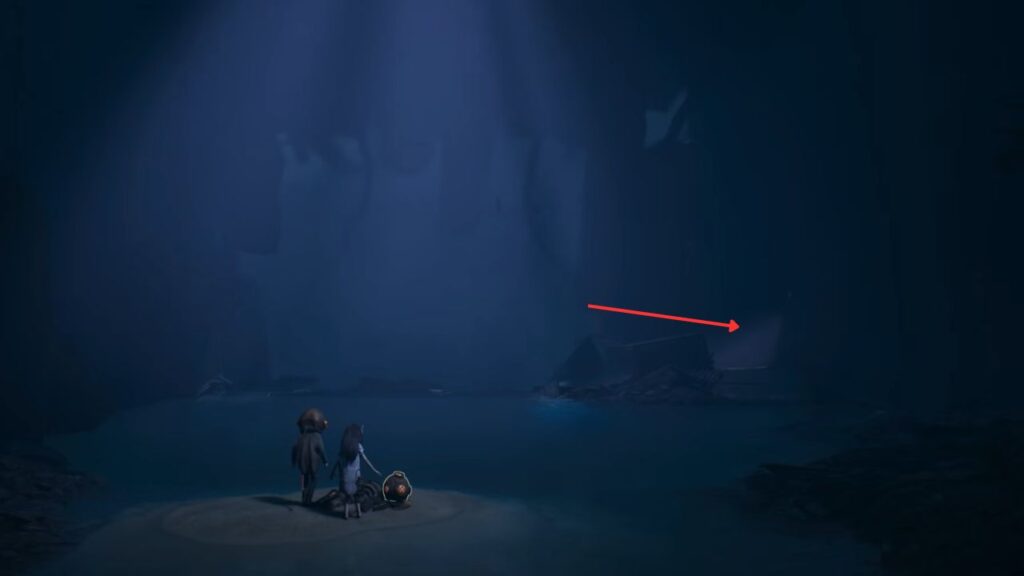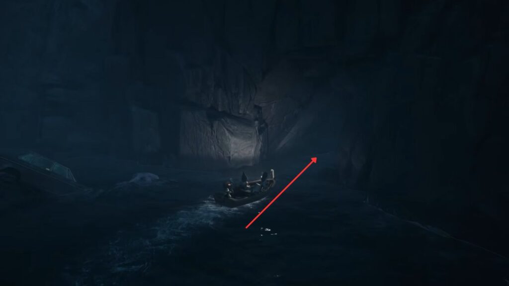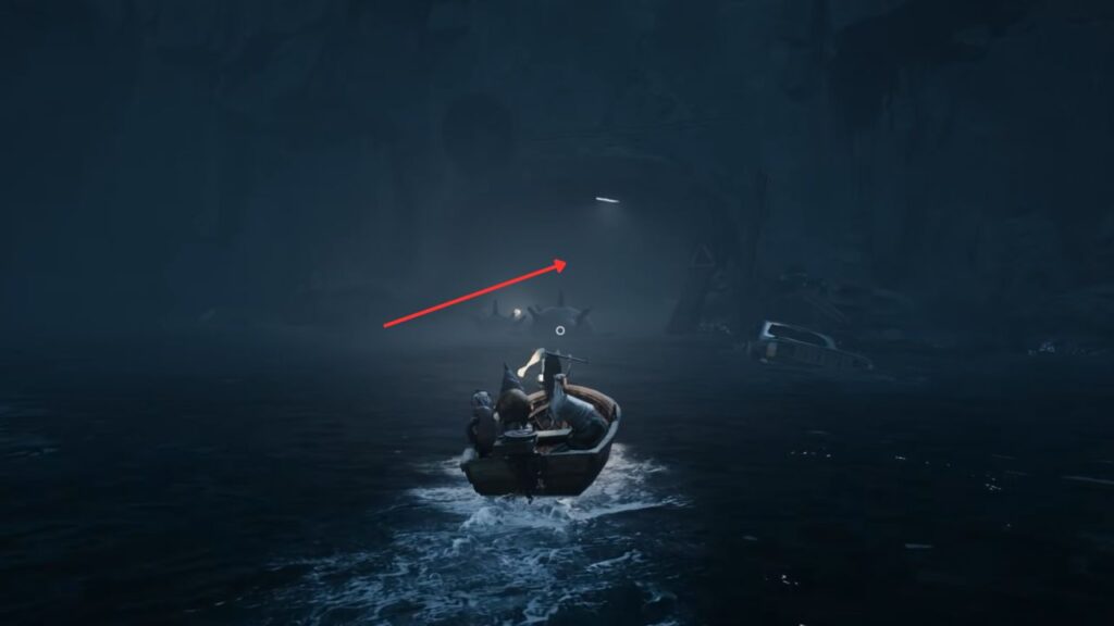 Finally, hug the right wall again and park the boat next to the red glowing light beneath the massive shipwreck.
