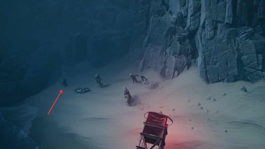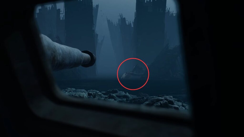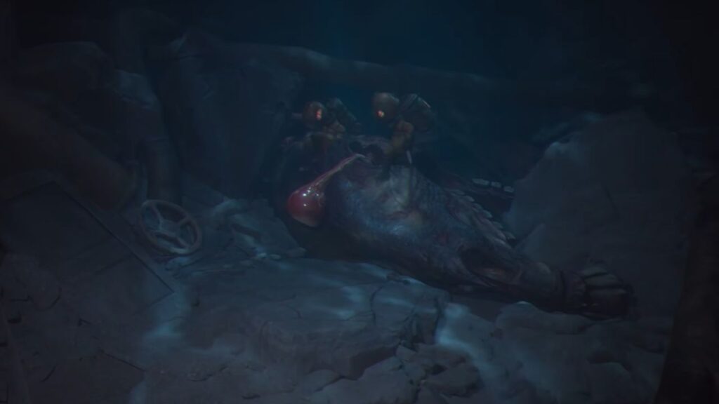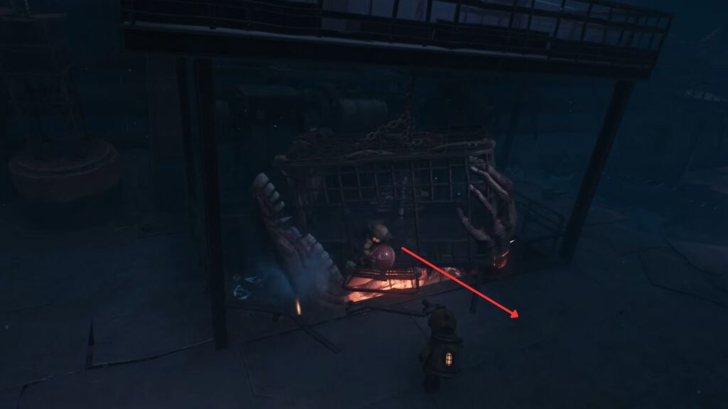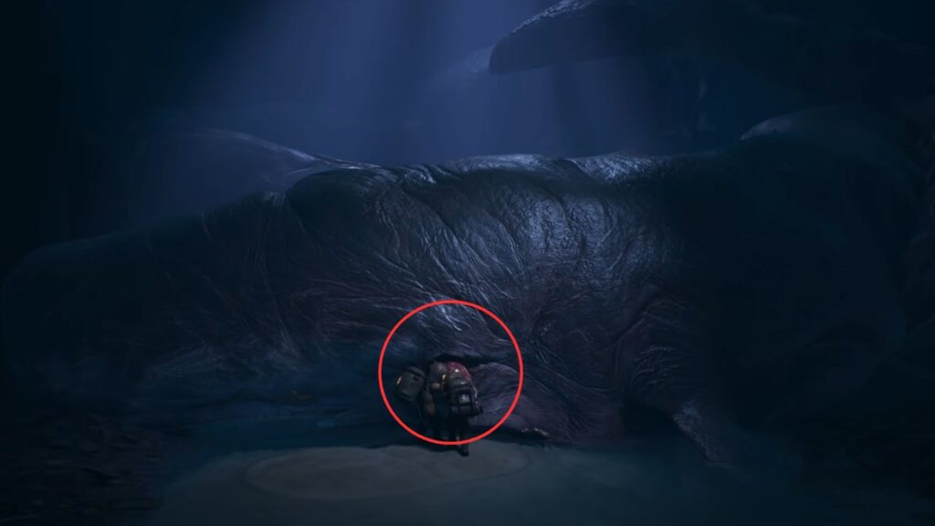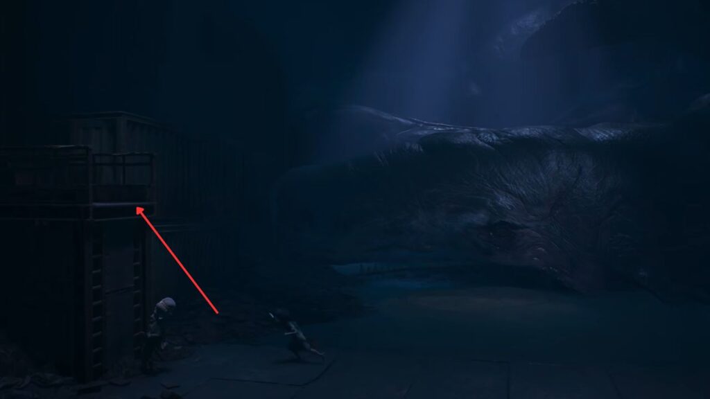 Follow the path, and at the end, you’ll come across what appears to be the monster that you shot with the cannon earlier. Climb onto its head, pull out its eye, and cut it. Yes, you read that correctly. After taking the eye, run back toward the elevator.