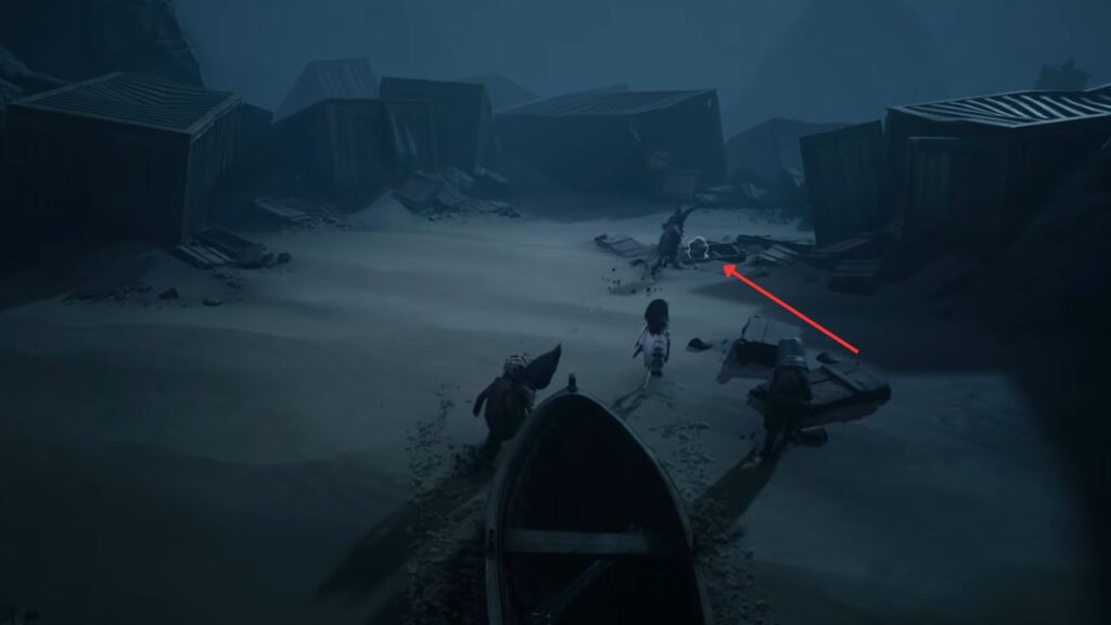 Get back on your boat and drive past the monster you just destroyed, making sure to blow up any mines you encounter along the way. Hug the right wall, destroy the mines blocking the path, and land your boat. In front of the right container, you’ll find a mask, pick it up, then return to the boat.