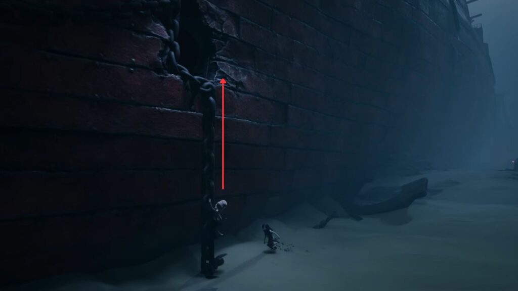 After landing, head west while fending off seagulls. After you climb the ledge, look for an anchor you can climb to enter the ship.