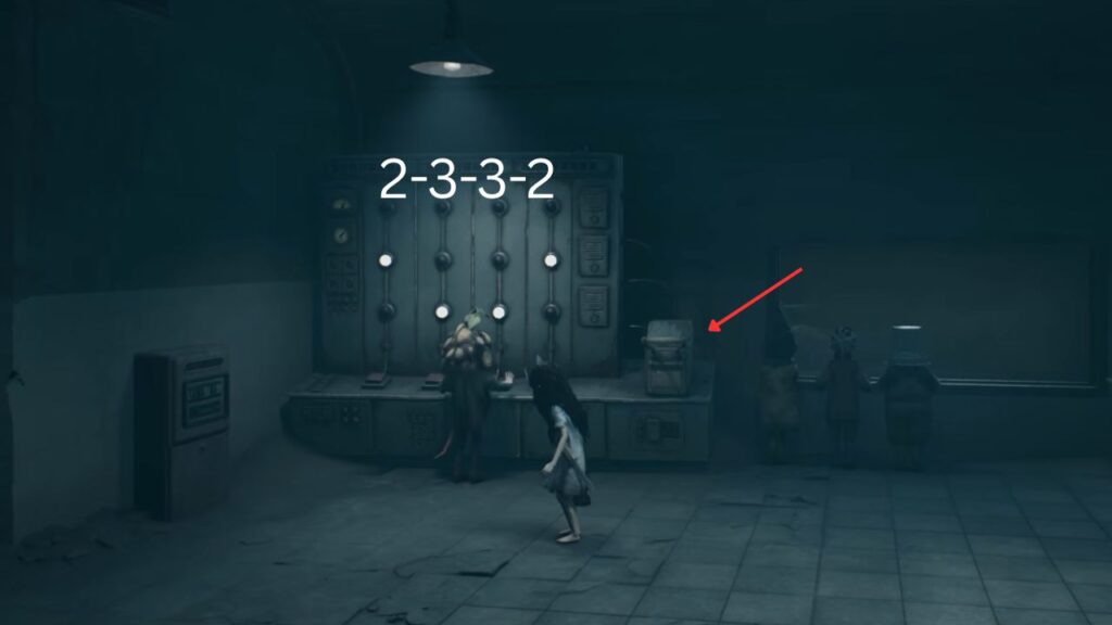 With the electricity powered on, you can interact with the machines. In the left corner of the lab, there’s a large console with light bulbs on it. First, set the lights in the following sequence from left to right: 2-3-3-2 (from top to bottom).