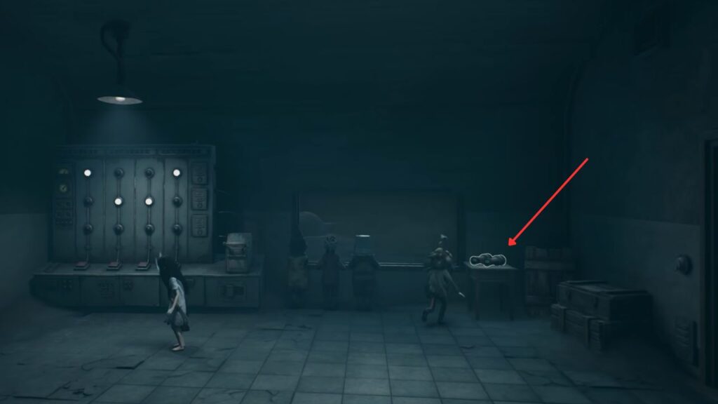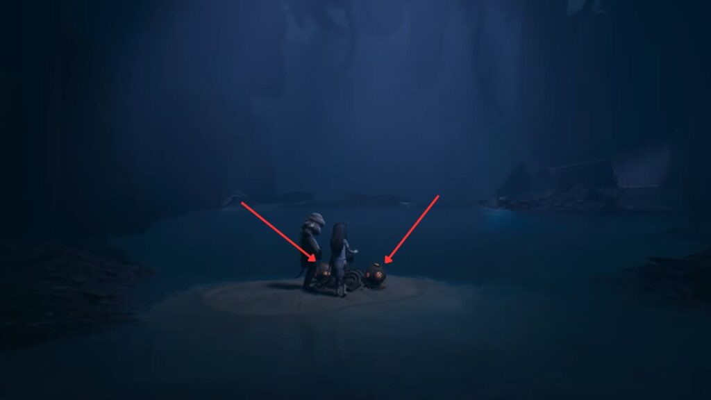 Back inside the ship, head to the gate and interact with the whale. Insert the eye into its eye socket and watch as the majestic whale moves away, clearing the path for your boat to continue. Before leaving, interact with both diving suit helmets to collect two mask collectibles.