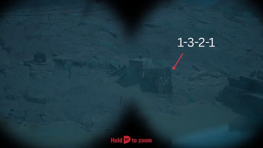 After grabbing the poster, pick up the binoculars from the table on the right side and use them to look through the glass. Find the crate that displays a code, you’ll need it to send ammunition to the massive artillery. The code is 1-3-2-1. Enter it on the console to trigger the delivery.