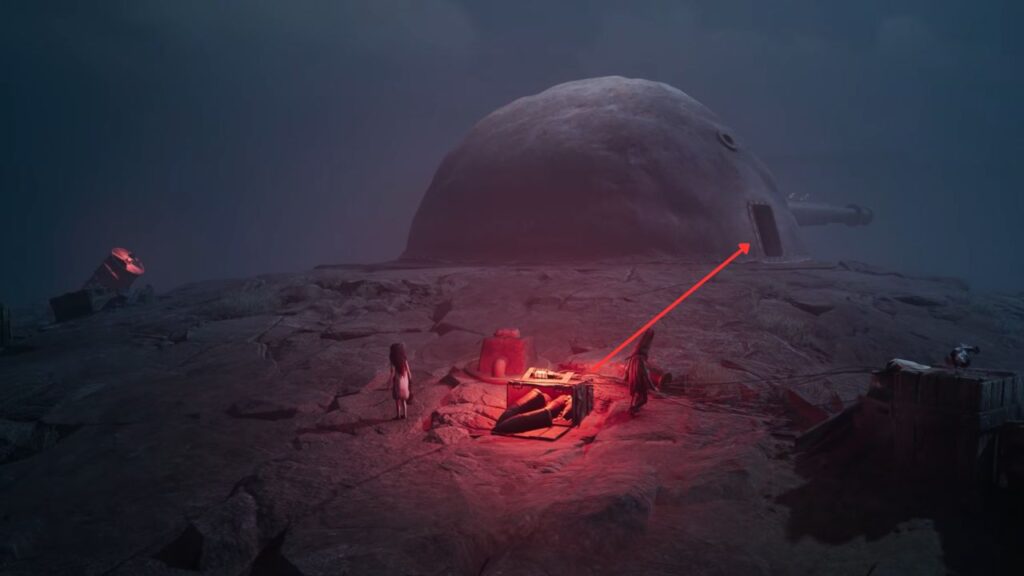 Once the cannon is loaded, press the button beneath the blinking light next to the door to open a window. Use the larger wheel to rotate the cannon until it’s aimed at the bunker you came from. Look for a single rectangular window in the middle of the stone cliffs.