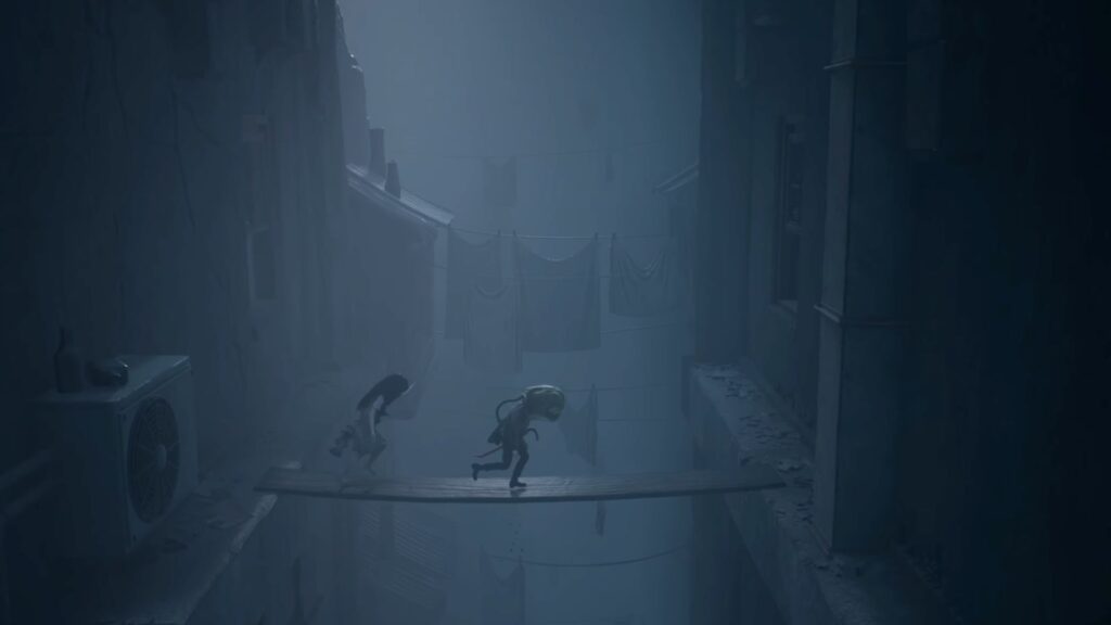 Head to the door at the far end of the aisle and go through it, crossing straight to the other side of the room. You’ll step out onto a high ledge running along the edge of the building — be very careful not to fall here. A wooden plank is already in place to help you cross over to the window of the building across from you. Walk through into the adjacent room and head down the stairs.