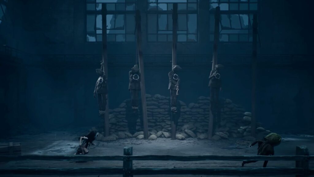 Keep moving straight and enter the next building, where you’ll find four corpses hanging from wooden pillars, each with a target painted on their body. Whoever the unknown shooter is, they’ve clearly been here before.
