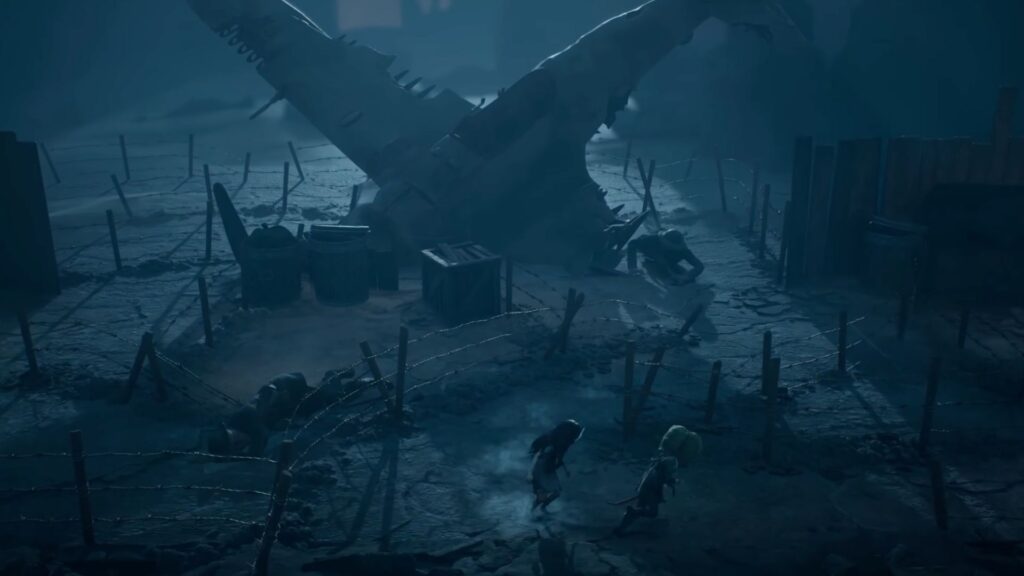 Head outside into a ruined backyard area. You’ll notice a plane wreck in the yard, and a creature will emerge from behind it. Dodge and stay out of its reach — before it can catch you, the unknown shooter eliminates it from across the yard.