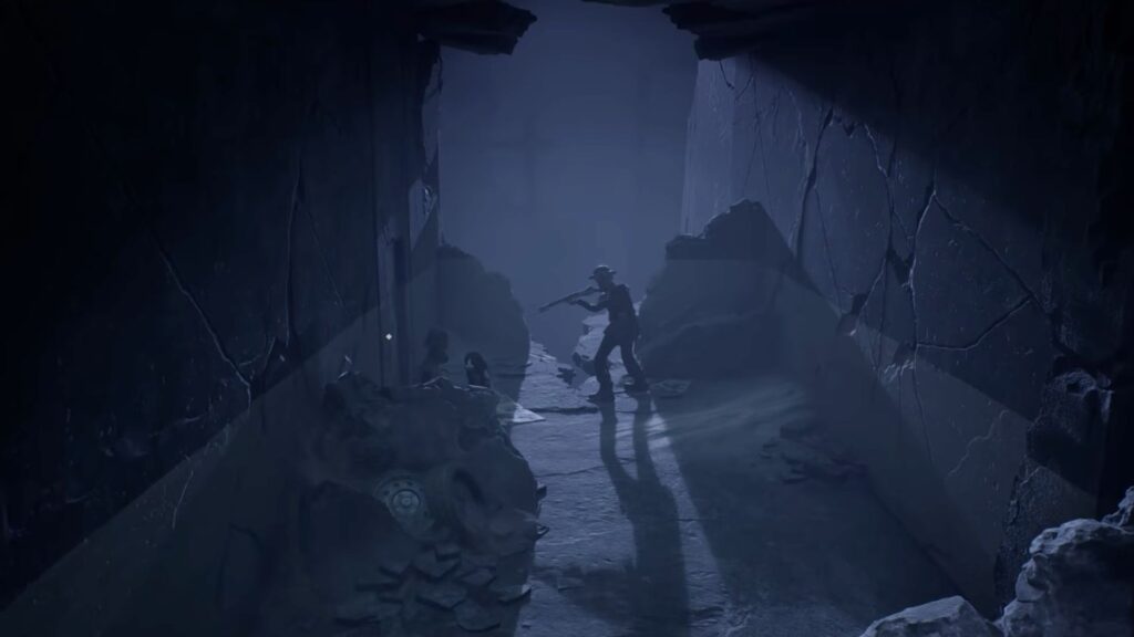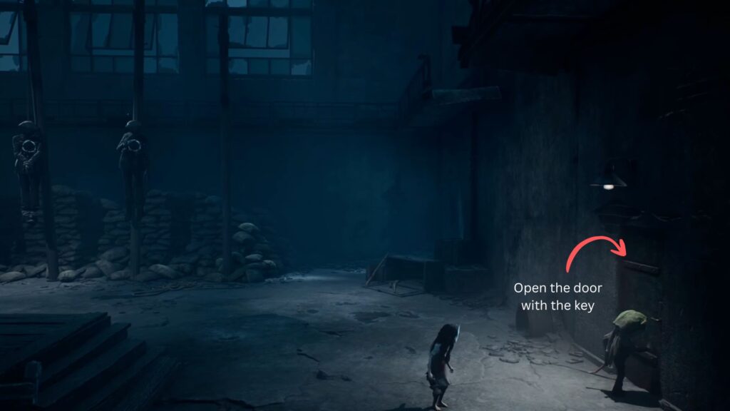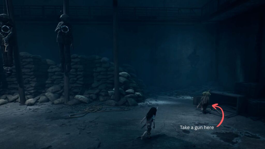 On the floor near some crates, you’ll spot a gun — pick it up and shoot the third corpse from the left, as it has a key in its hand. Collect the key and use it to open the door on the right side of the room.