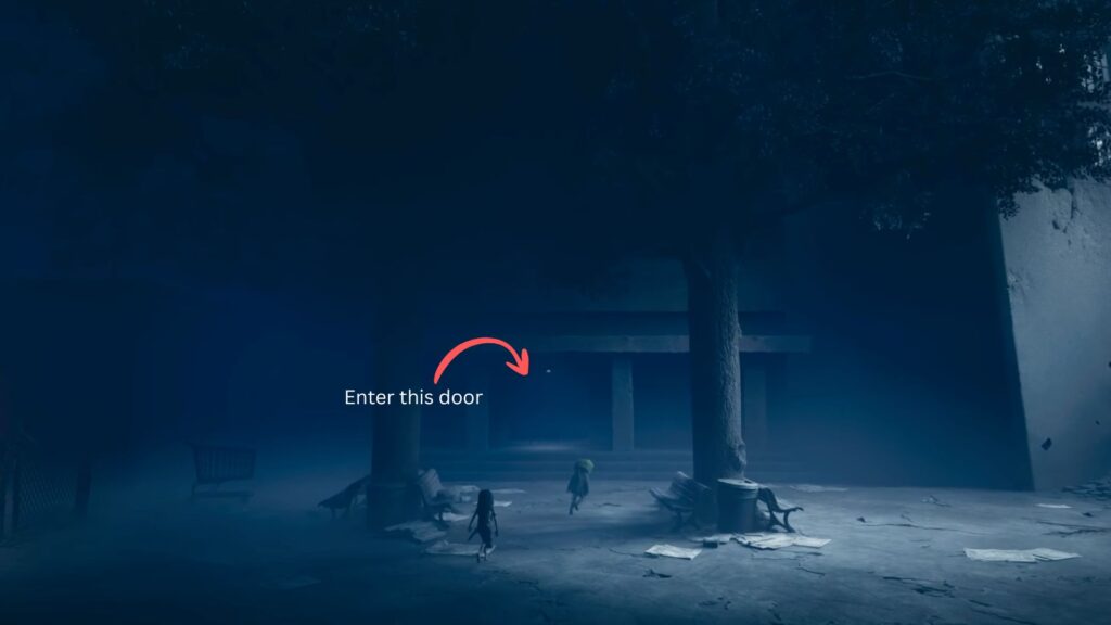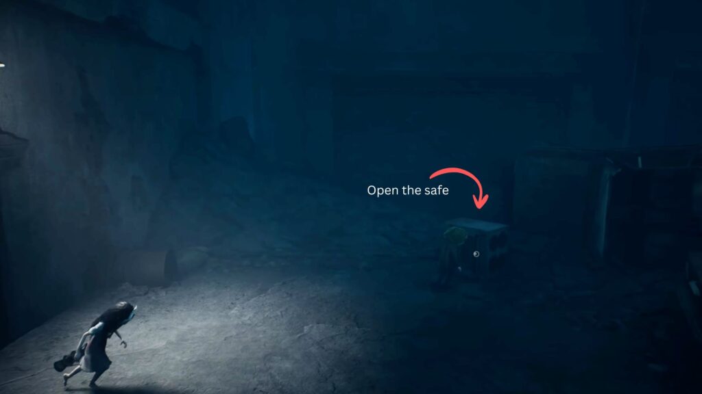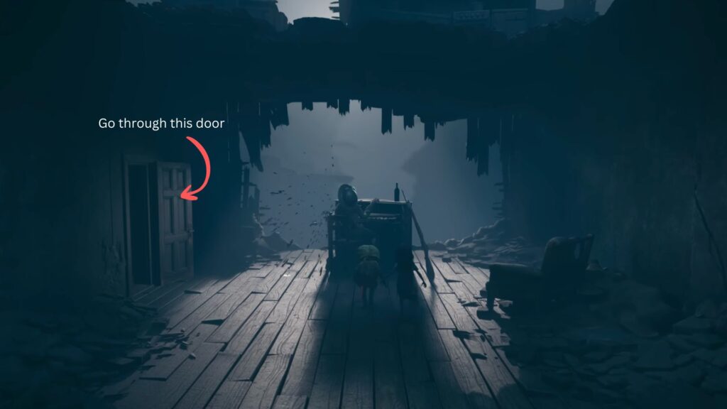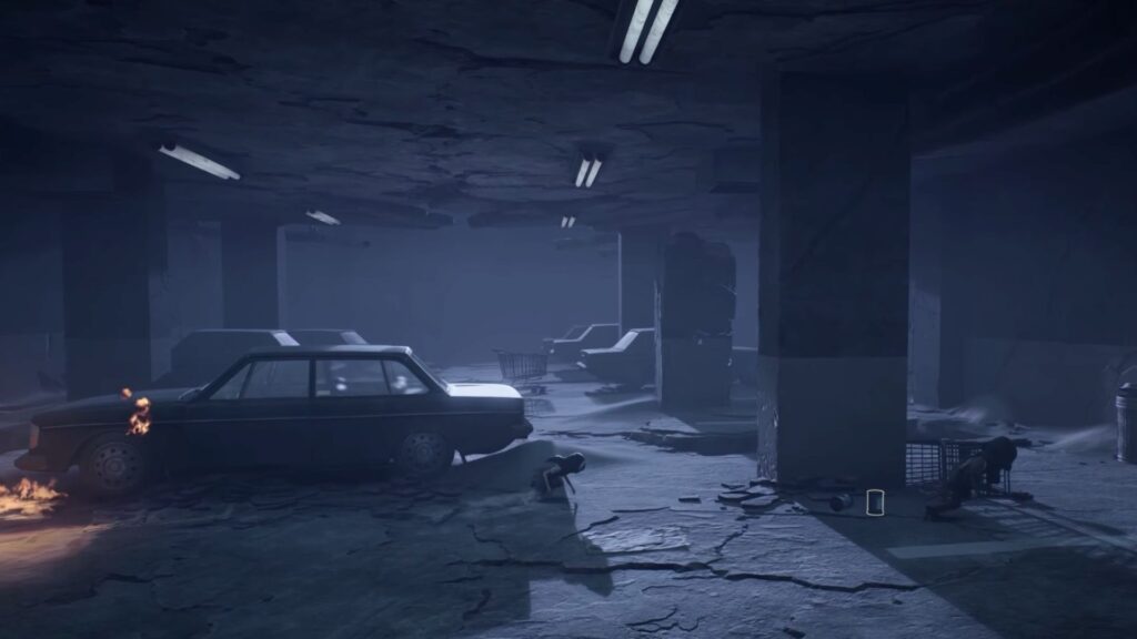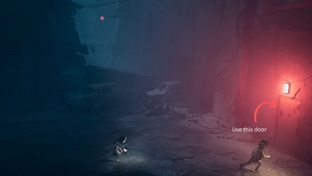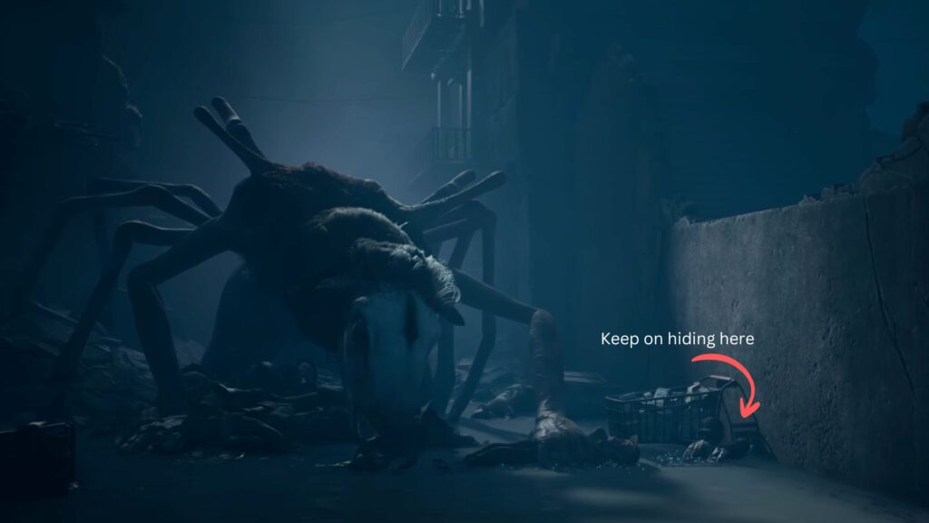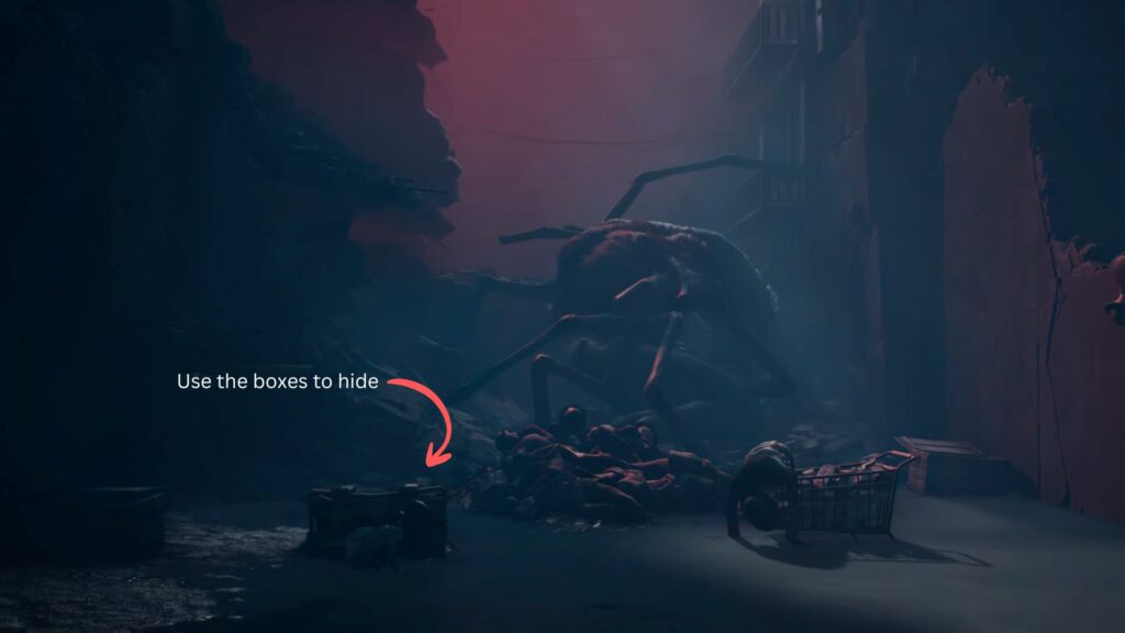Go back outside, climb up onto the broken car, and pass through the hole in the crumbling wall. A creature is already waiting on the other side and the screen will wash red the moment you enter. You’ll need to crouch and move carefully, using trolleys as cover to avoid being spotted.