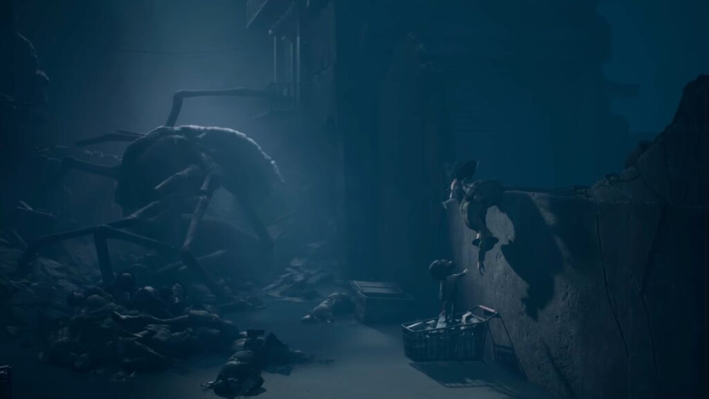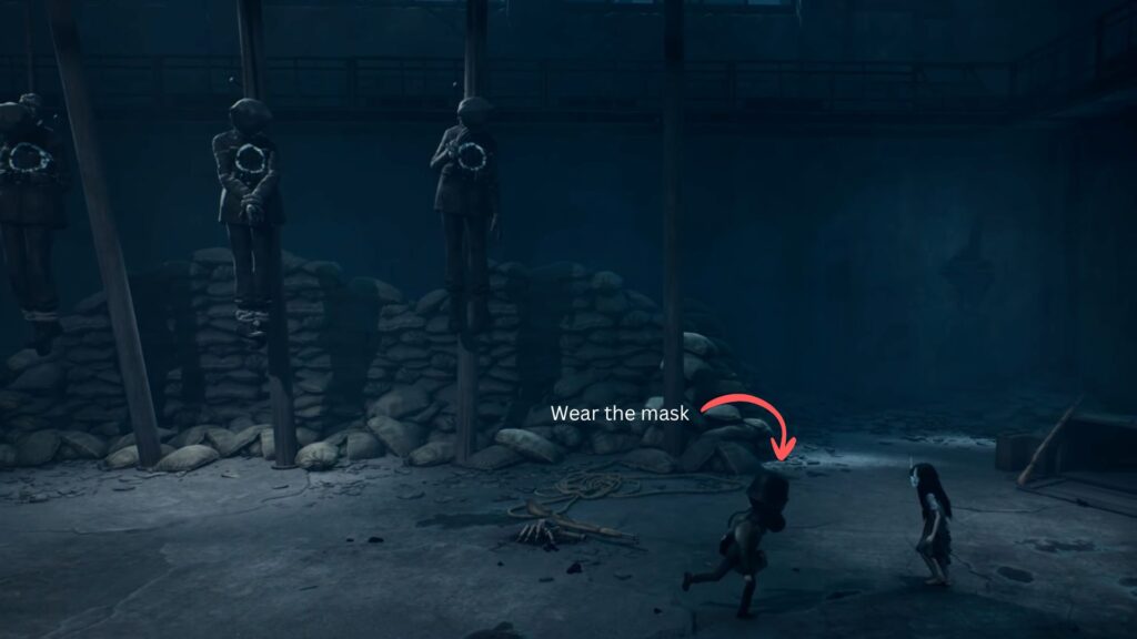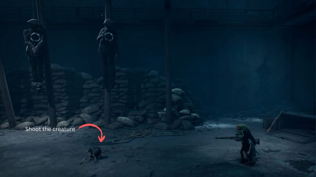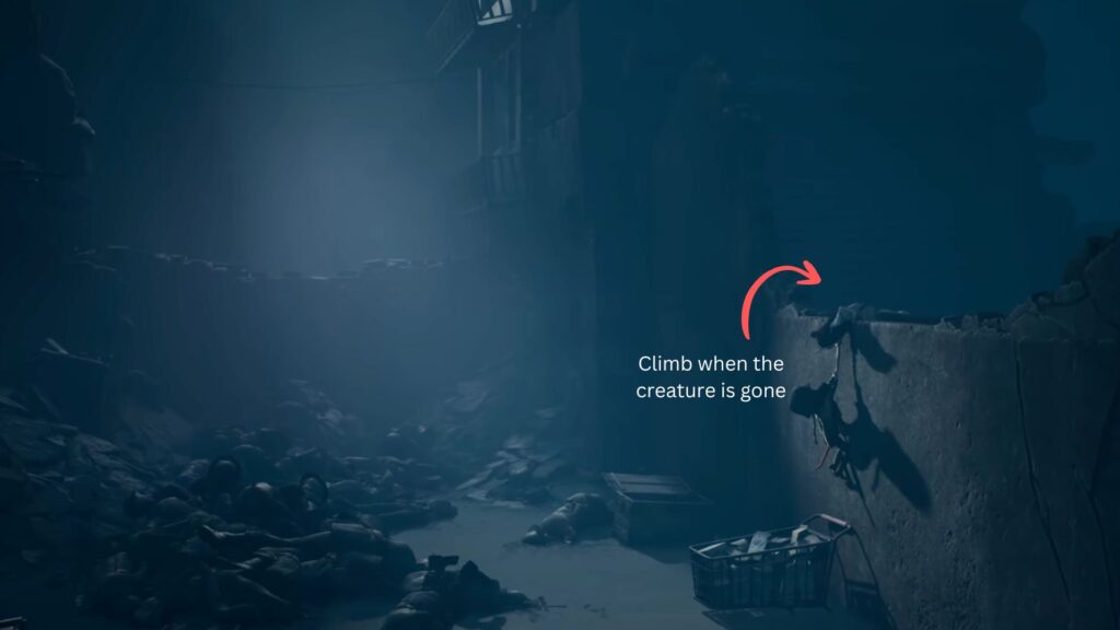 When the coast is clear, start climbing the wall. As you do, you’ll accidentally pull down a corpse hanging there, sending it splashing into the water below. The creature will notice immediately. Stay behind the trolley and wait for it to lose interest and move away. Once it does, climb up to the next area safely.