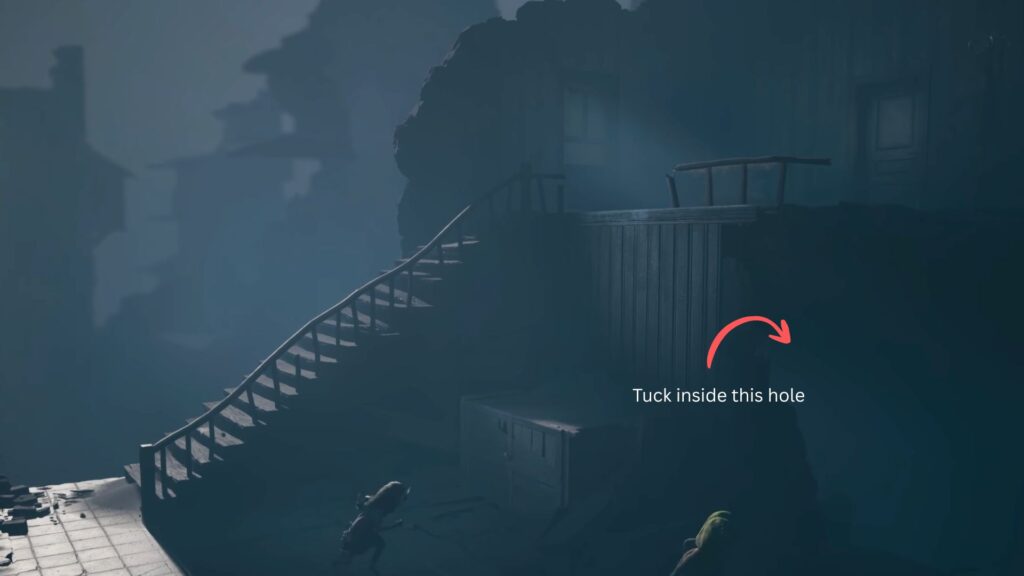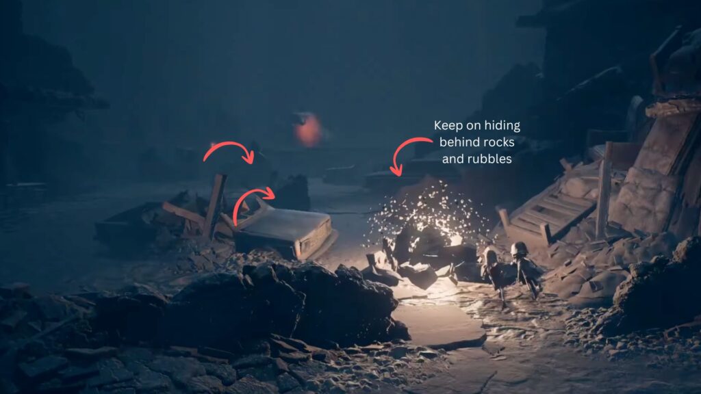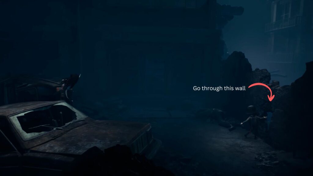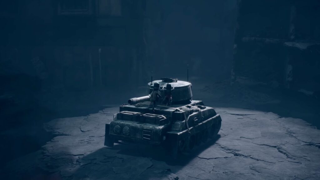 On the left side of the street, you’ll spot a tall opening in a wall with a glowing lamp above it. Head through it. Continue through the passage until you reach a tank. Wait for the soldier guarding it to be taken down, then climb inside with your sister.
