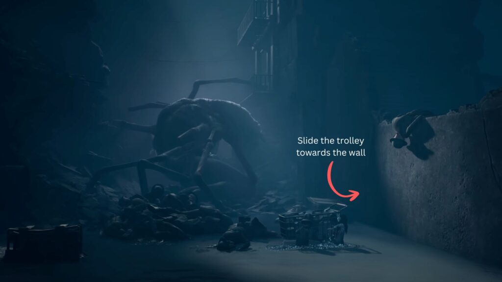 You’ll find the second trolley sitting in the water ahead — get behind it and slowly slide it toward the wall, only moving when the creature isn’t looking in your direction.