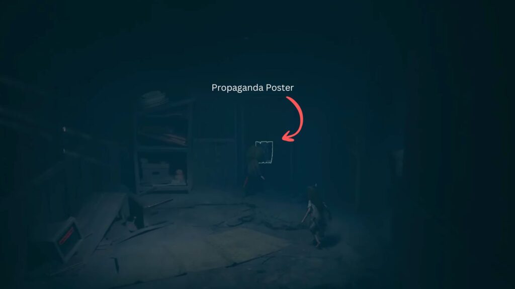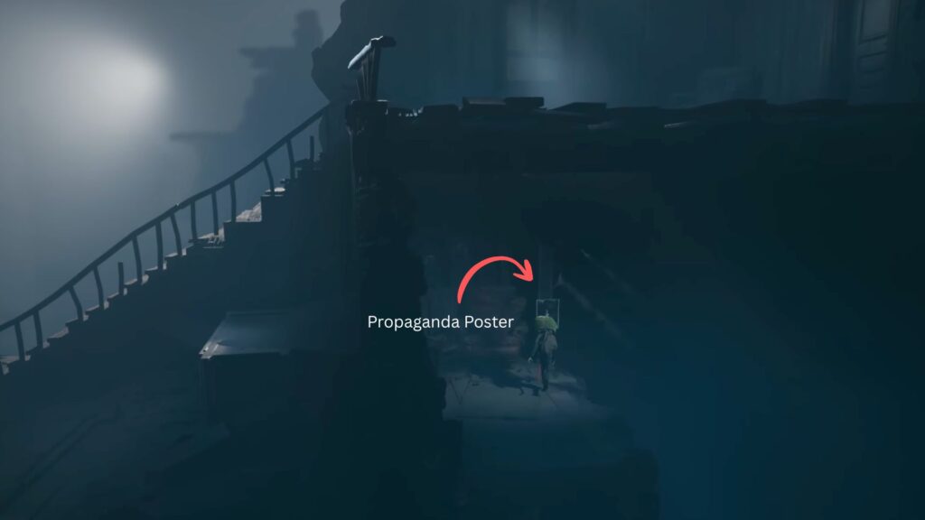 Follow the path forward until you spot a building with its entrance nestled between two large trees, with a hanging lamp above the door. Head inside and climb the stairs. You’ll witness a creature playing the piano before it’s suddenly shot from across the building by an unseen shooter. Go through the door on the left and climb the next flight of stairs. Inside the upstairs room, you’ll find the first Propaganda Poster of this chapter hanging on the wall.