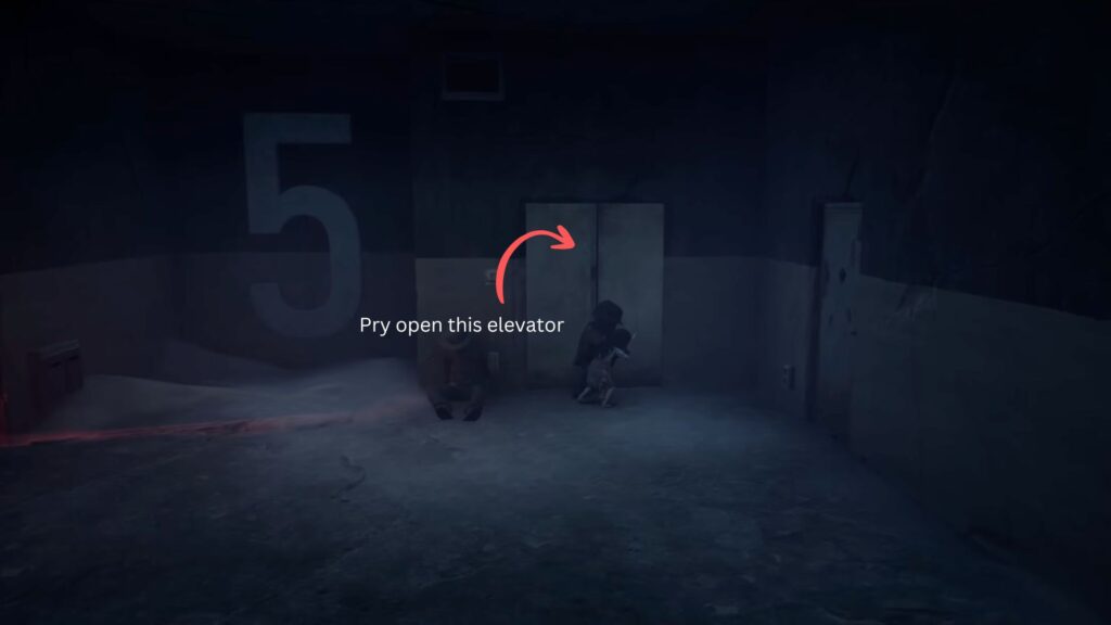 Go through the door beneath the red light — you’re now on the fifth floor. Ahead you’ll see an elevator. Pry the doors open with your pry bar to find another Propaganda Poster inside.