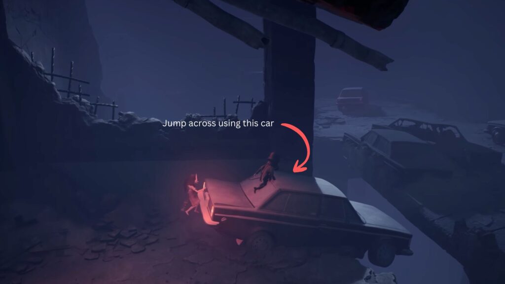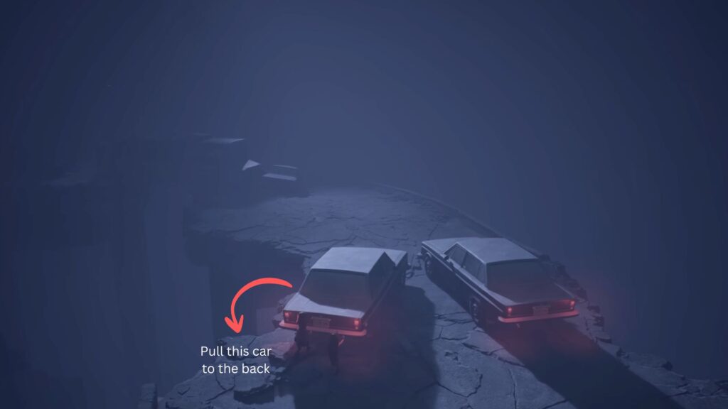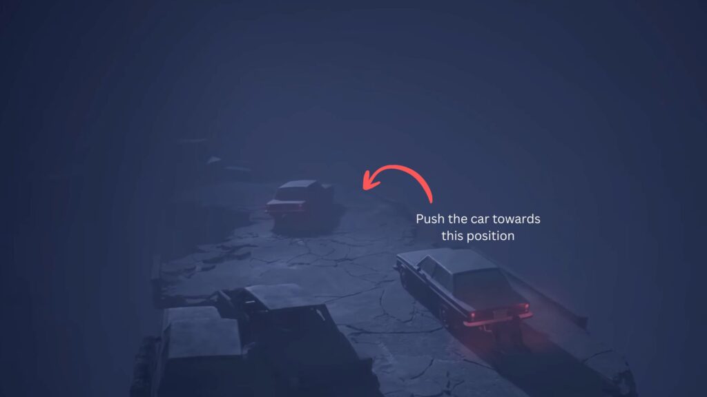 After making the jump and landing on a long platform, you’ll spot a car with its red hazard lights on. Get behind it and push it forward with your sister. Keep pushing until it makes contact with the car in front of it. Then pull the car on the left backward to clear the way, and continue pushing the first car forward.