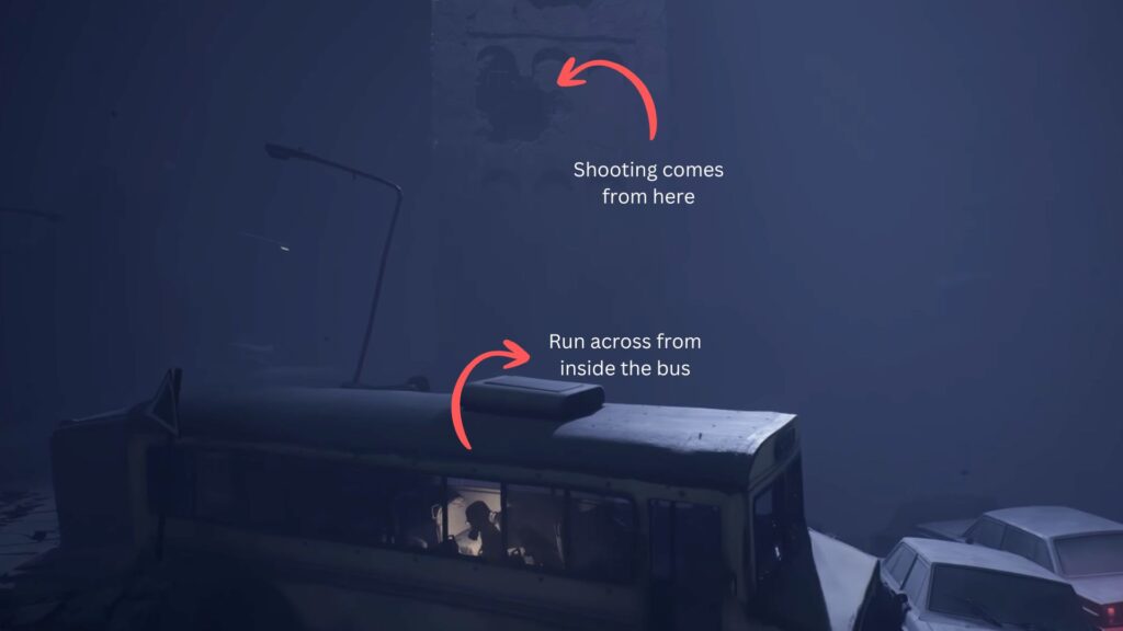 When you see a bus on the left side, run around and take cover inside it — the bus walls will shield you from the shots. From here, you’ll finally be able to see where the shooting is coming from: a tall clock tower directly ahead.