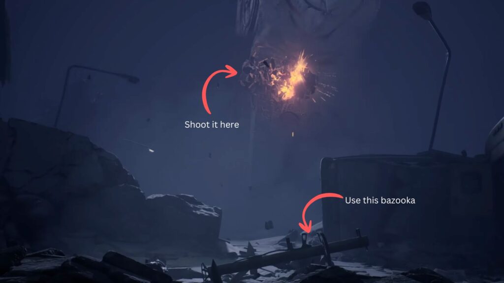 On the left side of the bus, look for a broken section of wall. A bazooka is lying on the floor — crouch down and work with your sister to pull it up. Aim it at the clock tower and fire. The shooting stops.