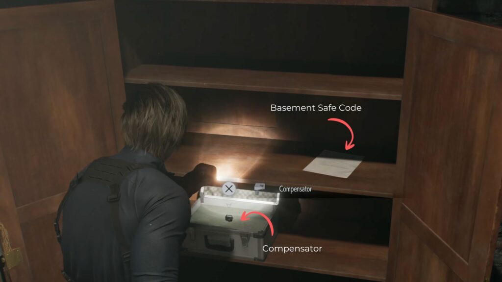 With Chunk down, continue through the white wooden door with glass panels in it. Follow the path and look for a wooden storage unit on the right side of the wall. Force it open to collect a Compensator, an attachment that reduces muzzle rise. Make sure to equip it to your gun right away. You’ll also find the Basement Safe Code here: → 60, ← 40, → 80.