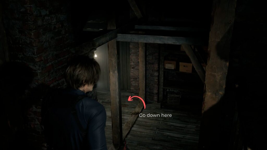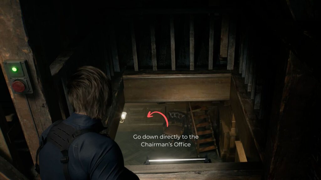 Head down the stairs to reach the Attic Storage. There’s a box of Ammo here. At the far end of the storage area, look for a small opening with a button nearby. Press it to lower a ladder that drops you straight down into the Chairman’s Office.