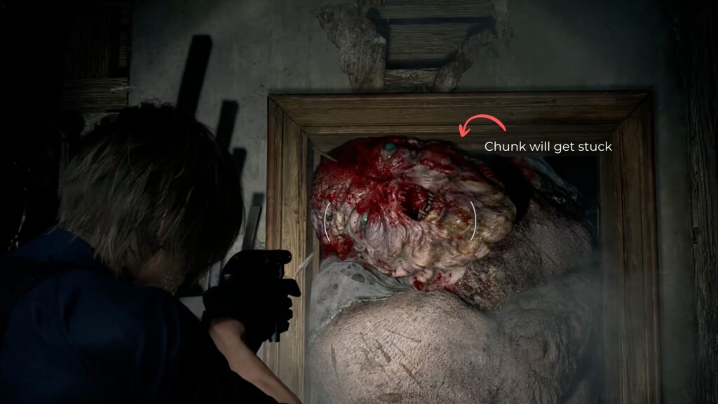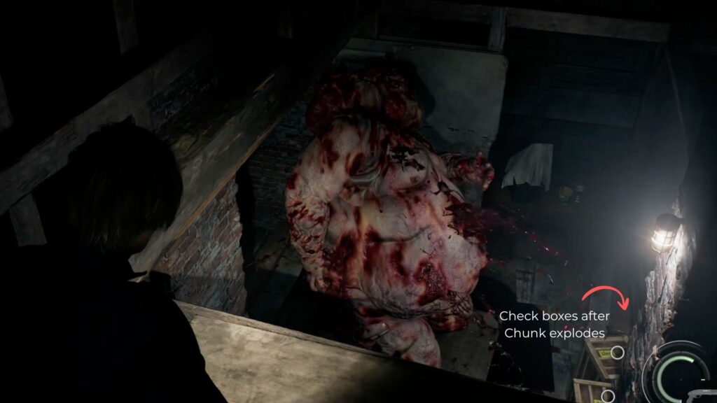 Chunk will immediately set its sights on you. The core strategy here is to keep landing headshots until it staggers and drops, then close in for melee attacks to save your limited shotgun shells. When it gets back up, back away along the passageway you came through and keep picking up any ammo scattered around as you go.