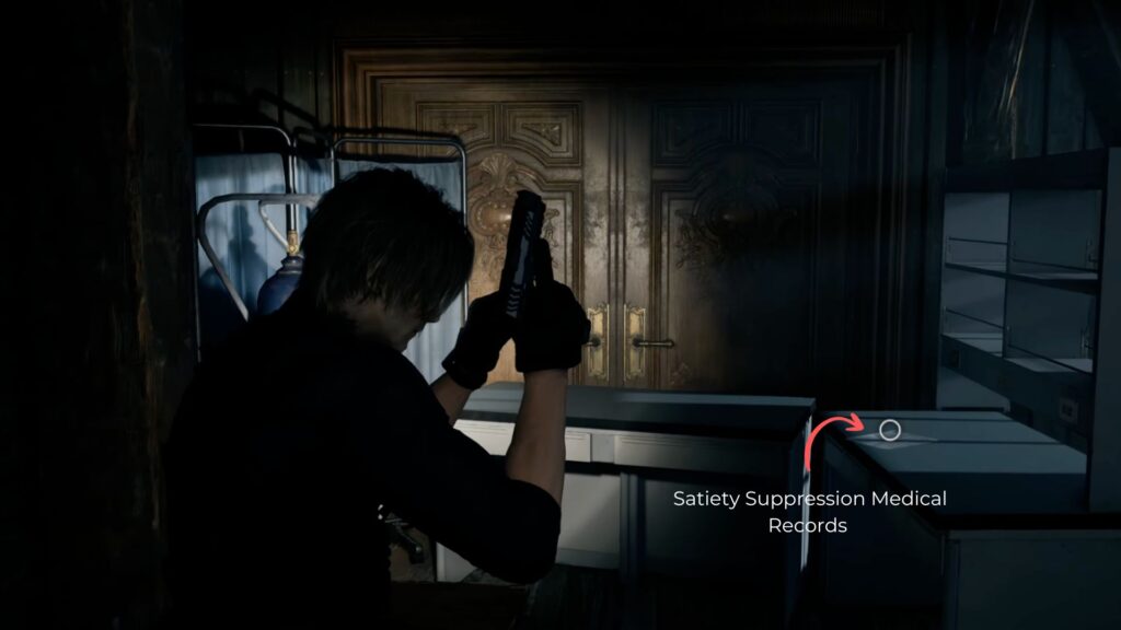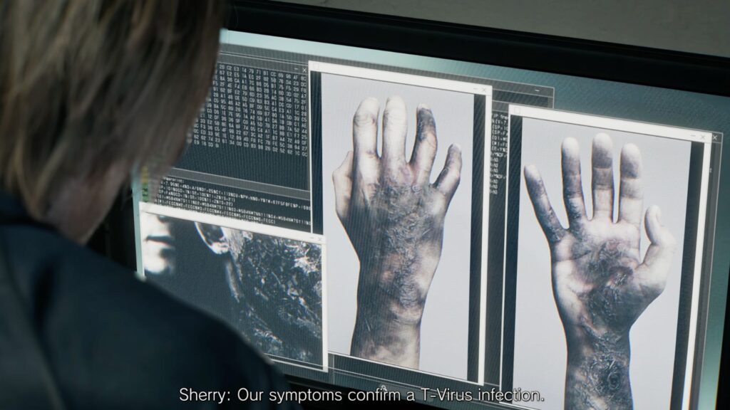 A cutscene plays. Leon uncovers more about the T-Virus and the illness that has been developing inside him throughout the game. A screen displaying his symptoms confirms a full T-Virus infection. He also finds a note ending with the phrase “for the sake of Elpis” — the same word Victor used when he first encountered Grace.