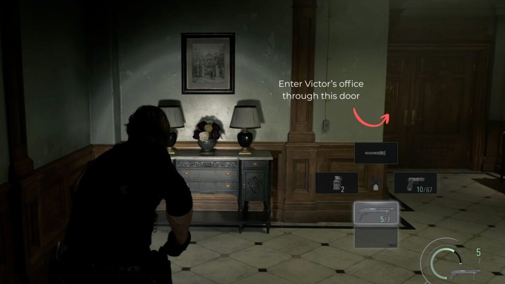 The chapter opens with Leon captured by Victor Gideon and tied to a chair. After a brief exchange, Leon secretly cuts through the rope binding his hands with a hidden knife and gets into a scuffle with Gideon. Leon manages to grab a gun, but Victor retreats down through the attic door, locking it behind him and warning Leon that he’s a dead man walking. Now, your mission is to find another way out of the attic and locate Victor’s office in the Care Center.